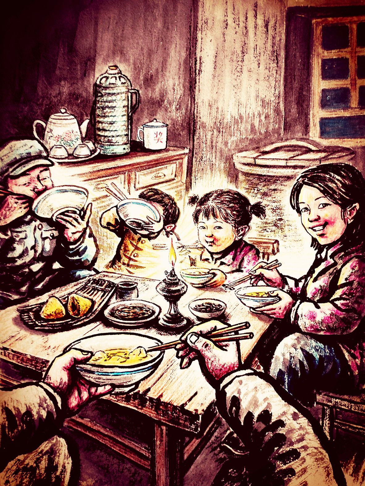 家家还有必备的寓意团圆的炸丸子,寓意和睦的炸藕盒,寓意有福气的炸豆腐。包饺子的馅料要提早准备出来,饺子面和好了,要盖在被子下面饧一饧。包饺子的讲究也不少,饺子的样子像元宝,所以,包饺子时不许点个数,寓意财富无限;饺子在盖垫上要顺时针排列,不许乱摆乱放,寓意阖家安顺和睦;不管是馅还是饺子皮,包到最后不能说“完了”,寓意家财无穷无尽等。年三十晚上的饺子必须是肉馅的,象征着一年来日子过得肉头、富裕。年初一的饺子必须是素馅的,象征着新的一年全家安康素净。大人们在包饺子过程中,还会说一些因讲不吉利的话而被“神搬仓”“狐大仙”惩罚的故事,以警示包饺子时必须遵守的禁忌。天刚擦黑,各个屋里都点上油灯,院子里挂上灯笼。贴在门上的红色对联以及怒目圆睁、神采威武的门神,在或明或暗的灯影里闪烁着,伴随着缕缕的香火味儿,给忙碌的人们心里不由地增添了许多庄重、神秘的气息。