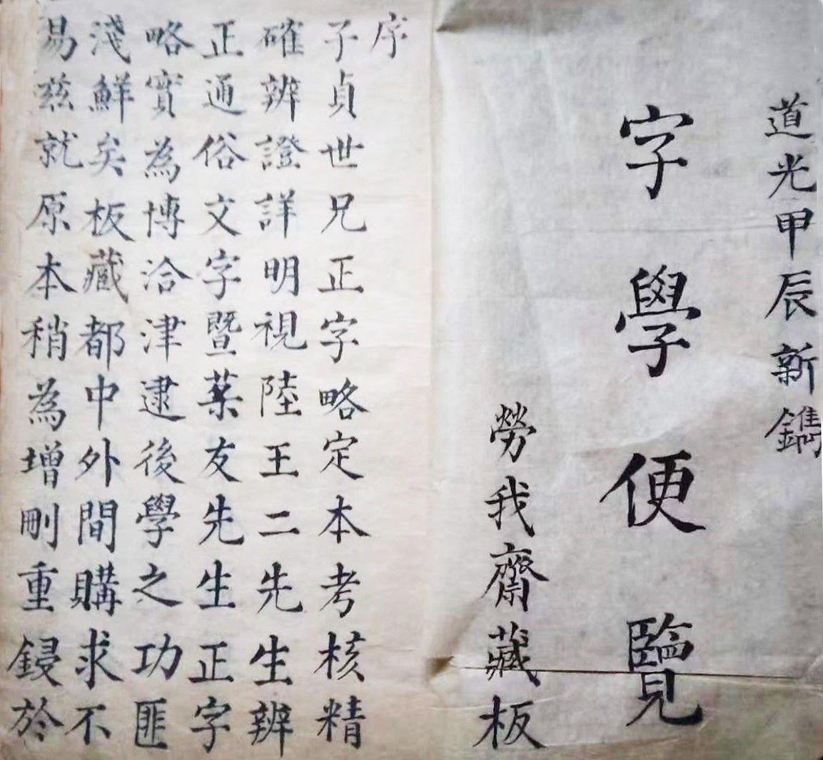 这本由德棱额亲手撰写并称之为《字学便览》的册子,成书时间为道光二十四年(1844)。由“劳我斋”刻、藏板。从德棱额自己撰写的序言中可以了解到,德棱额与同时期的书法家何绍基(字子贞)很亲近,称子贞为世兄。并且说道,子贞世兄编写了一本《正字略定》,为京城学子提供了习字的工具书,内容很翔实、很全面。可是,在我们这里却很难见到。如果到京城搜求,路又远而且价格又昂贵,乡下学子们负担有困难,还不一定能买得到。有鉴于此,所以自己下决心,根据记忆,在何子贞编印的那本《正字略定》的基础上,给予增删、完善,为德平学子重新编写一本功能类似字帖和辞典相结合的常用字工具书。德棱额在序言里强调说,我这样做可不是剽窃子贞兄的成果,是为了解决德平学子没有习字工具书的燃眉之急,才想到的这个没有办法的办法。如果有一天,子贞世兄见到了我编撰的这本书,可千万不要责怪啊!