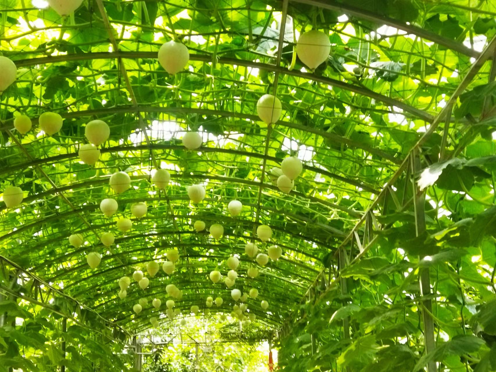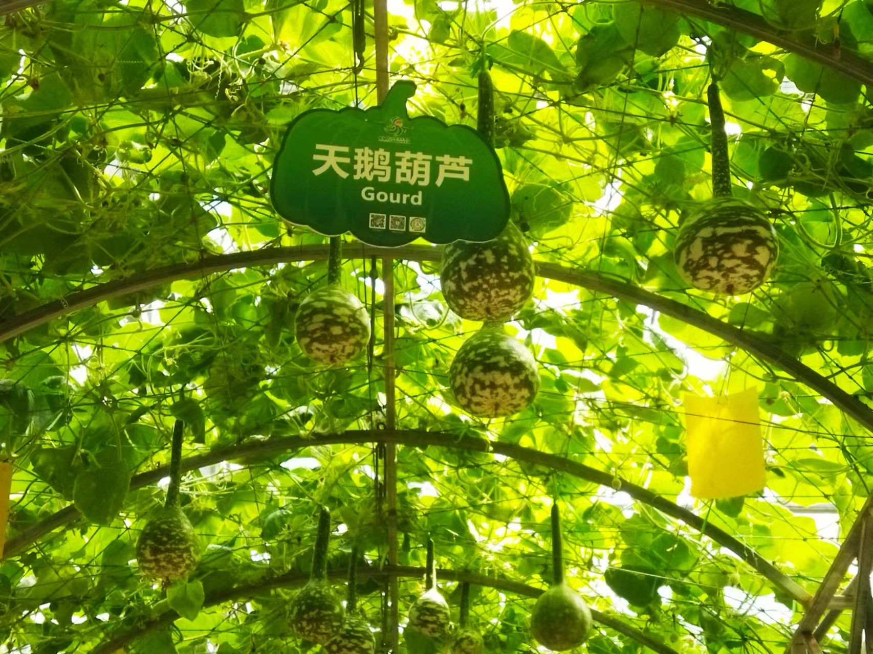 我饶有兴致地游走于各个展馆或展区,菜博会上蔬菜种类之繁多和花样翻新的各种产品又使我始料未及。据展馆工作人员介绍说,今年的菜博会展示了2600多个蔬菜品种,其中新品种600多个,先进种植模式80多种,前沿技术120多项。仅以人们餐桌上常吃的茄子为例,我就亲眼看到展馆内勃勃生长着的冠红长茄、烧烤长茄、俊美线茄、绿长茄、花奇紫茄、北斗绿宝茄、黑宝圆茄等不下10个品种。再如悬挂在展馆长廊上的葫芦也有七八个种类,其中就有大黄葫芦、鹤首葫芦、瓢葫芦、长柄葫芦、天鹅葫芦等。尤其是那天鹅葫芦,尾部圆大敦实,颈部高昂且细长,头部弯曲,远远看去酷似天鹅,栩栩如生,煞是可爱。在这里,可以说每一样蔬菜都有几个让你看得见、摸得着的新品种,从而让你既开了眼界又大饱眼福。