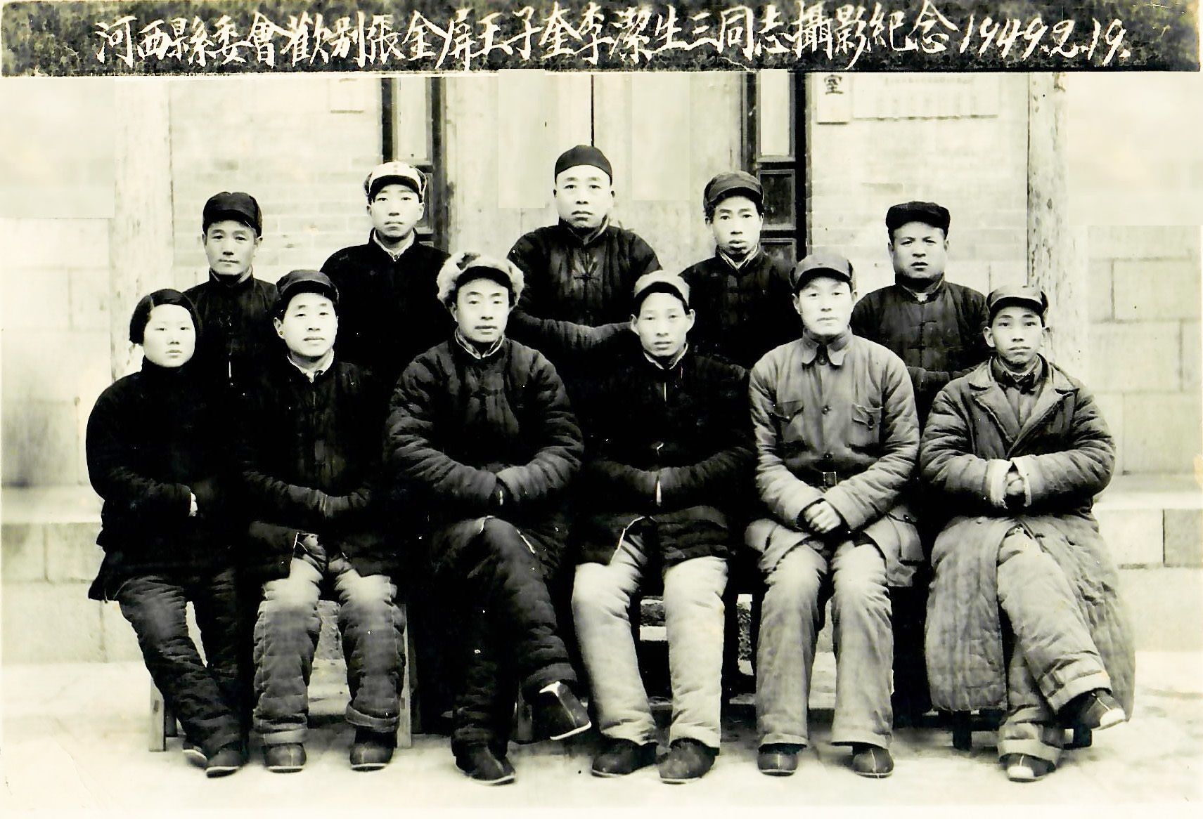 1949年2月19日,河西县委欢送县委书记张金屏(前排右三)等同志南下工作合影留念。图中前排右四为朱信谟