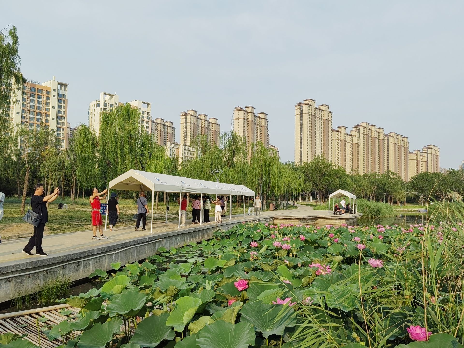 这遮阳棚的搭建,原是市里 “为民办实事” 的一桩小事。公园管理人员说:“赏荷是雅事,不该叫暑气败了兴致。” 于是,这条长廊便从图纸上延伸至湖畔,既遮阳挡雨,又与荷塘景致相得益彰。晨练的老人常在这里歇脚,他们摇着蒲扇闲话家常:“这棚子搭得真及时,不然这大热天的哪敢出来遛弯,这遮阳棚真是搭进老百姓的心坎里了。” 偶尔还能听见他们和游人闲聊:“今年的莲花开得好,鸟类多,是环境湖水养得好。”
