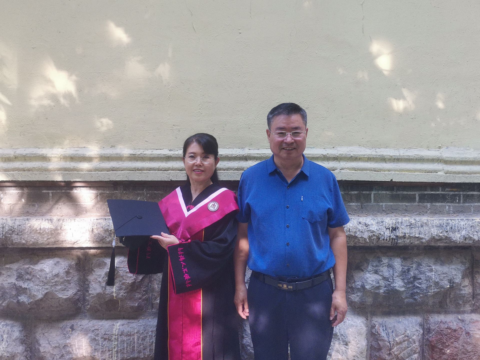 抬头往东一眼就看到了那架我们曾经熟悉的紫藤树,妻子走过去坐在树下的石凳上,我快速给她拍照留念,有好几个女同学正在树荫下复习功课。往南一看,终于找到了那棵曾经的迎客松,原来它的南面建起了一座高大的实验楼,尽管它长得很壮硕,也不再是当年的迎客松模样了。转眼往西看到立的一处石碑,写着“曲阜师范学院旧址”,是山东省文物保护单位,应该包括旧文史楼和西联教室。西联教室是一排苏式建筑,共有五个教室,青砖青瓦,前出厦,斜顶,红色门窗。大一时,我们二班和一班在西联二合堂上课,三班在前边旧文史楼上课;大二时,我们二班和三班在西联一合堂上课,一班在旧文史楼上课。本想进去找到当年的座位坐一下,可惜门都锁着。透过窗玻璃瞅一眼,讲台竟然从东头换到了西头。教室前边的几棵梧桐树更加粗壮葱郁,树周围砌上了圆形石凳,供同学们在树荫下学习,整个地面也铺成了大理石,干净平整。从西联一和西联二中间往北看到一棵梨树,树叶油亮,硕果累累。从背面再看教室,整个教室则被茂密的爬山虎所覆盖。再绕到西联一西首,看到墙壁上写着“道之所存,师之所存也”一行字,两个着学士服的女生正在以此为背景拍照,妻子也兴奋的借来女同学的学士服让她们帮着拍照留念。