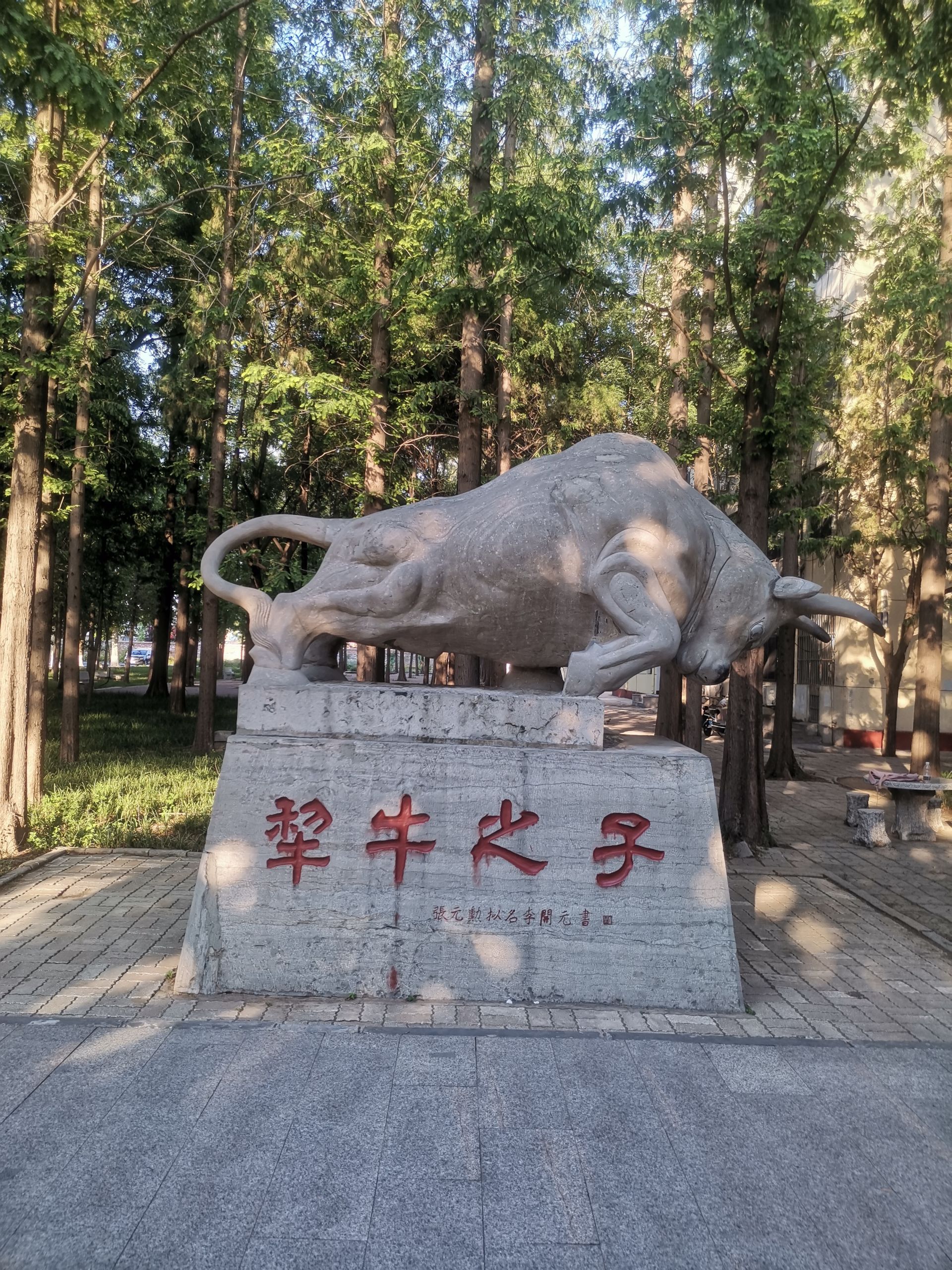 沿着东侧林荫道往南走,发现了一座“犁牛之子”的雕像,石雕的牛栩栩如生,充满张力,雕像的创意来自中文系的张元勋教授,成语出自《论语雍也》子谓仲弓,曰:“犁牛之子骍且角。虽欲勿用,山川其舍诸?”张教授对屈原颇有研究,讲课富有激情,经常有别系的学生来旁听,座无虚席。最后我们来到了萃华园,当时还有围墙,现在是开放式的了,小桥、假山、大门还在,增加了荷花、喷水池,花园门前的图书馆成了校史馆了。记得图书馆西边墙山高处是包备武先生书写的“图书馆”三个大字。目前在萃华园北的图书馆名是赵朴初先生题写的。
