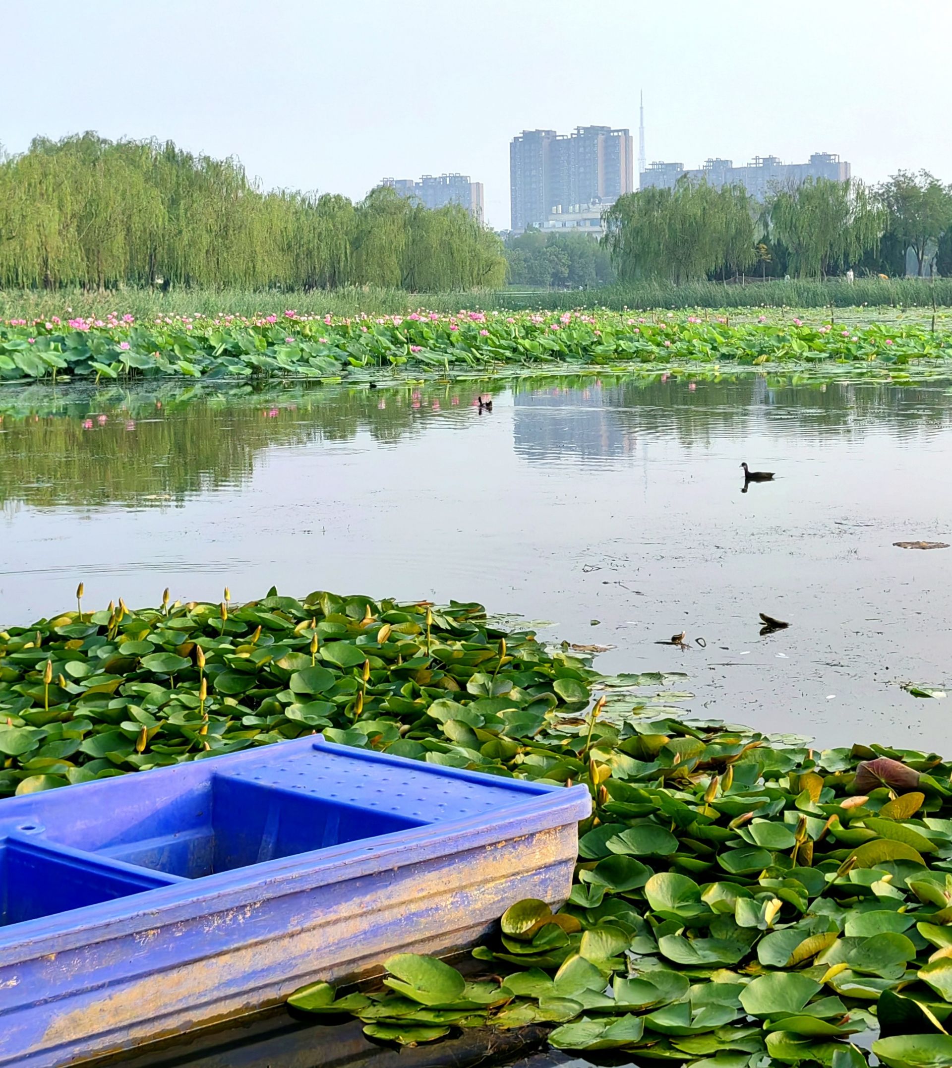 长河季夏,无车马之喧嚣。有荷盖环绕,红英垂露,如霞帔绛绡;绿柄擎珠,似壁缀青瑶。长廊分波,误入花深。蝉鸣高树,鱼戏蓬荫。红蕖绽露,麝气暗浮;荷风袭袂,清芬暗度。