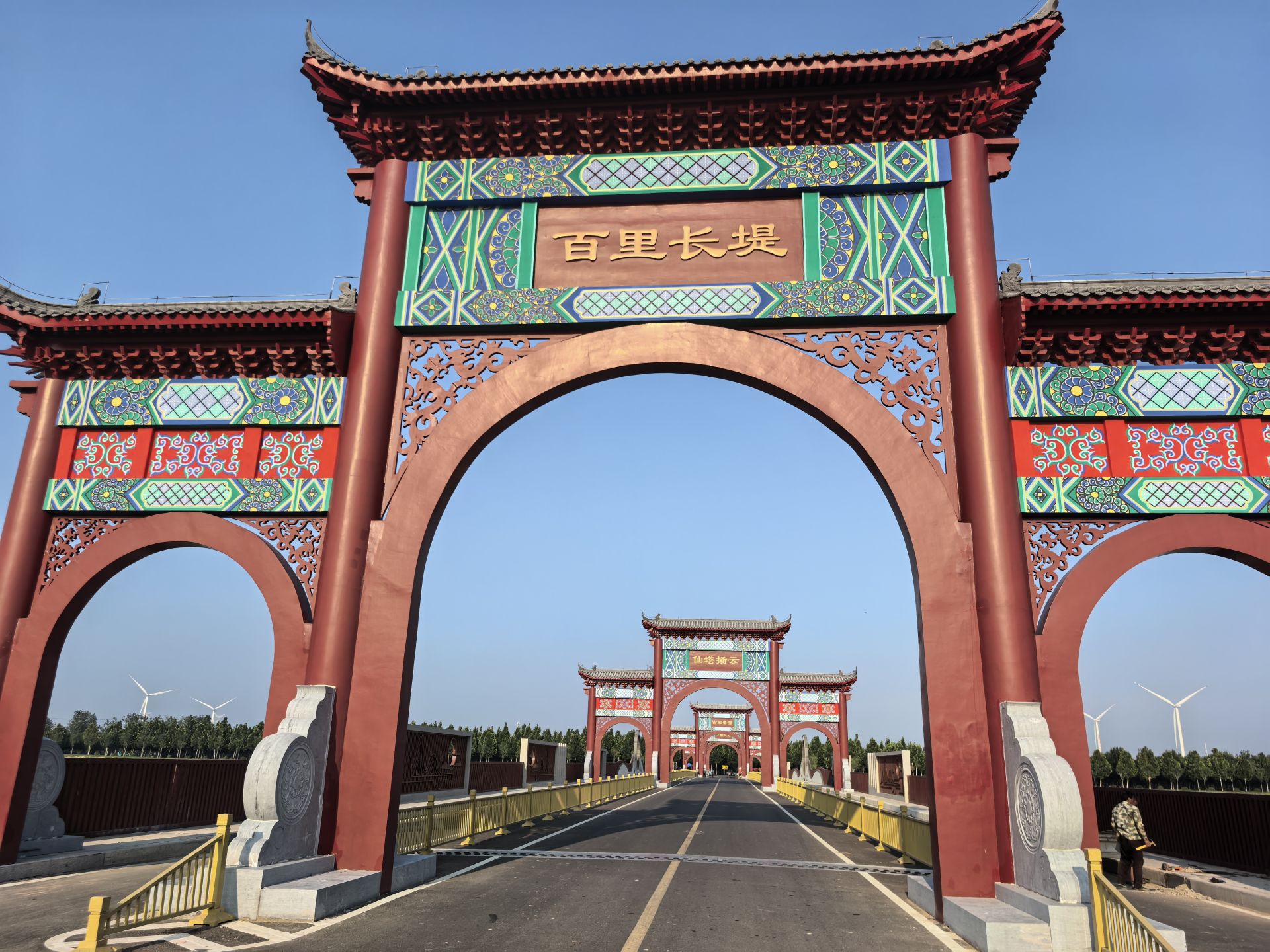 站在网红桥上由东向西望去,依次矗立着六座高大的牌坊。每座牌坊中间有一扇大门,左右两侧各有一小门。