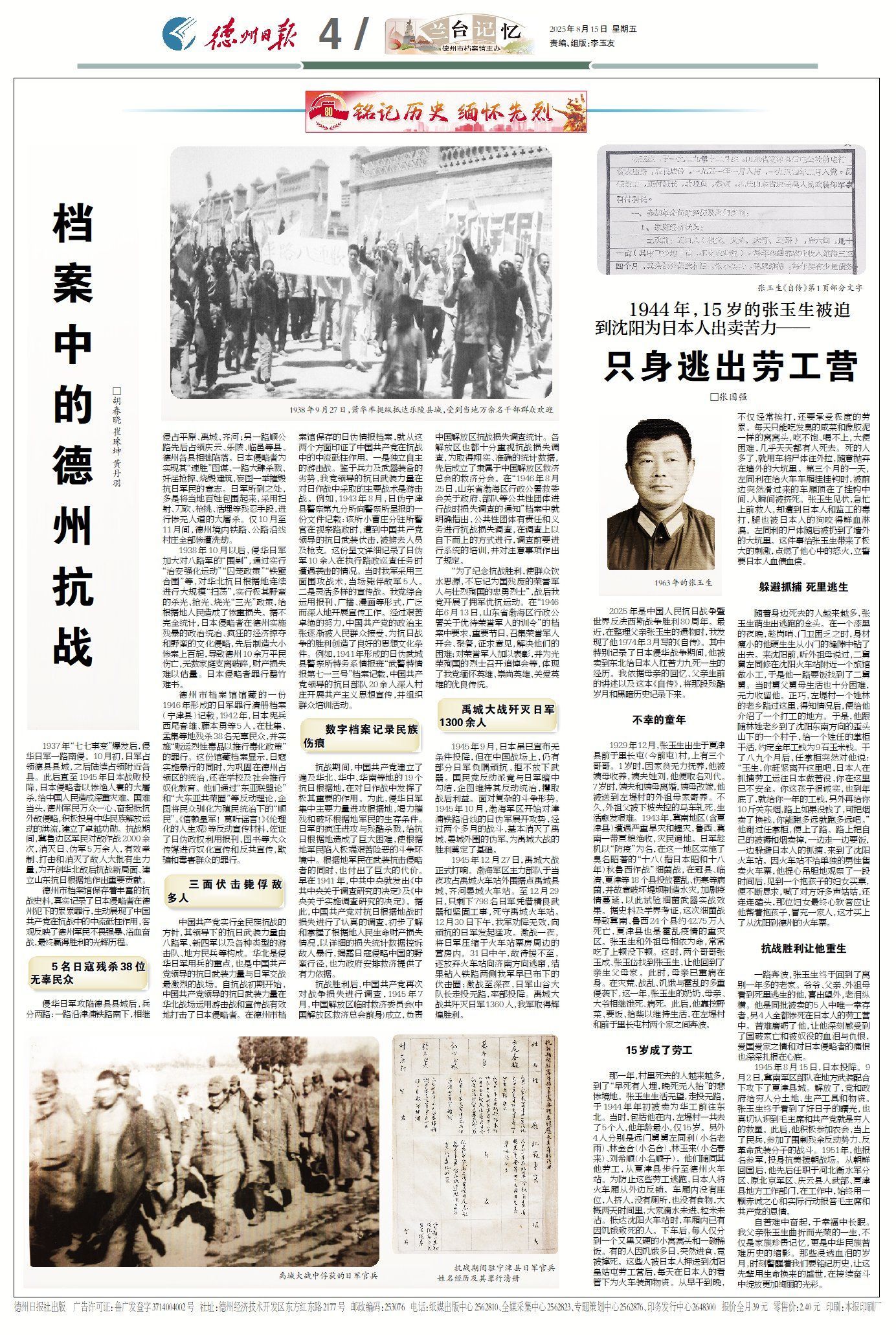 那一年,村里死去的人越来越多,到了“早死有人埋,晚死无人抬”的悲惨境地。张玉生生活无望,走投无路,于1944年年初被卖为华工前往东北。当时,包括他在内,左堤村一共去了5个人,他年龄最小,仅15岁。另外4人分别是远门舅舅左同利(小名老雨)、林金合(小名合)、林玉来(小名春来)、刘希顺(小名顺子)。他们随同其他劳工,从夏津县步行至德州火车站。为防止这些劳工逃跑,日本人将火车厢从外边反锁。车厢内没有座位,人挤人,没有厕所,也没有食物,大概两天时间里,大家滴水未进、粒米未沾。抵达沈阳火车站时,车厢内已有因饥饿致死的人。下车后,每人仅分到一个又黑又硬的小窝窝头和一碗稀饭。有的人因饥饿多日,突然进食,竟被撑死。这些人被日本人押送到沈阳皇姑屯劳工营后,每天在日本人的看管下为火车装卸物资。从早干到晚,不仅经常挨打,还要承受极度的劳累。每天只能吃发臭的咸菜和像胶泥一样的窝窝头,吃不饱、喝不上,大便困难,几乎天天都有人死去。死的人多了,就用车将尸体往外拉,随意抛弃在墙外的大坑里。第三个月的一天,左同利在给火车车厢挂挂钩时,被前边突然滑过来的车厢顶在了挂钩中间,人瞬间被挤死。张玉生见状,急忙上前救人,却遭到日本人和监工的毒打,腿也被日本人的狗咬得鲜血淋漓。左同利的尸体随后被扔到了墙外的大坑里。这件事给张玉生带来了极大的刺激,点燃了他心中的怒火,立誓要日本人血债血偿。