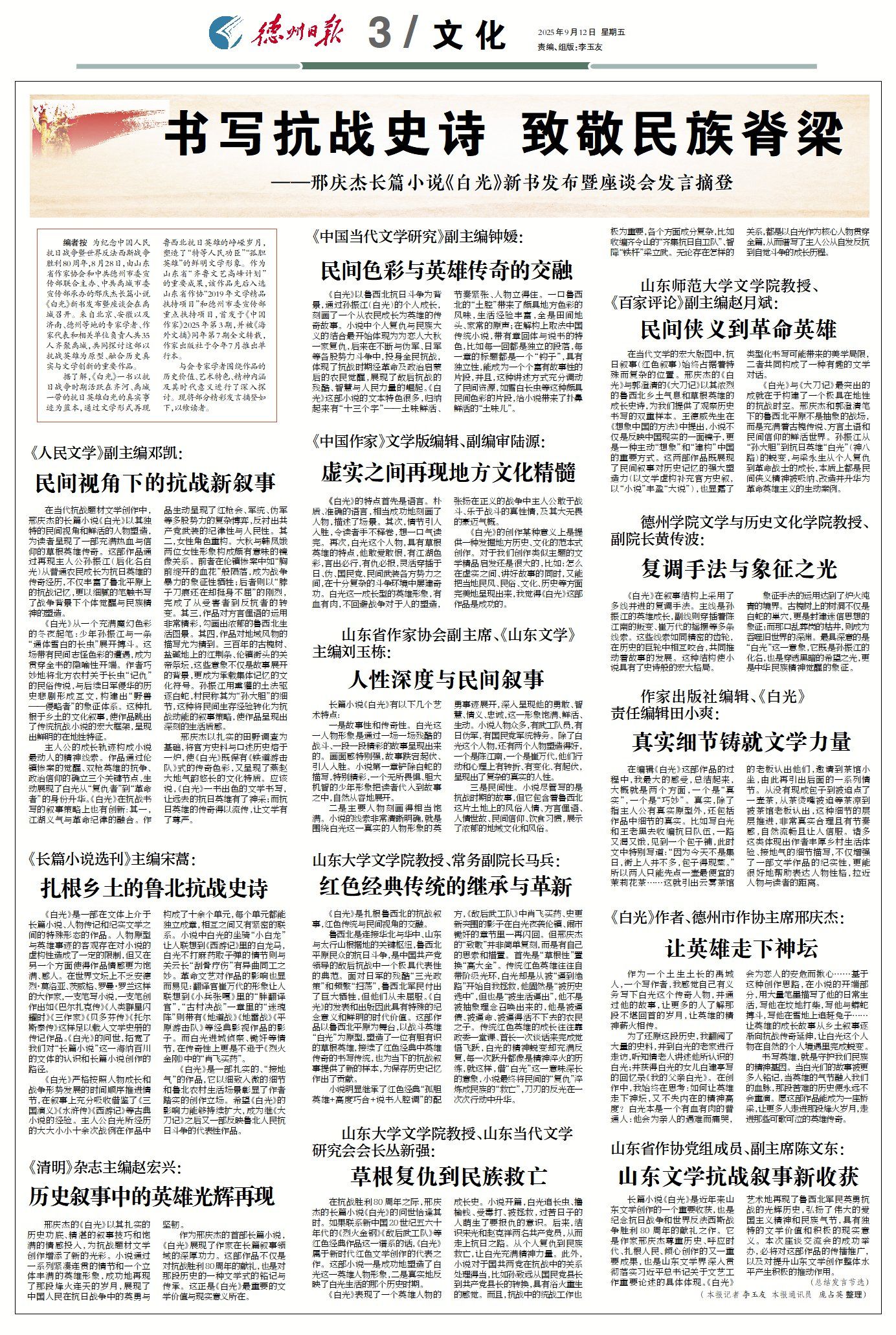 据了解,《白光》一书以抗日战争时期活跃在齐河、禹城一带的抗日英雄白光的真实事迹为蓝本,通过文学形式再现鲁西北抗日英雄的峥嵘岁月,塑造了“特等人民功臣”“孤胆英雄”的鲜明文学形象。作为山东省“齐鲁文艺高峰计划”的重要成果,该作品先后入选山东省作协“2019年文学精品扶持项目”和德州市委宣传部重点扶持项目,首发于《中国作家》2025年第3期,并被《海外文摘》同年第7期全文转载,作家出版社于今年7月推出单行本。