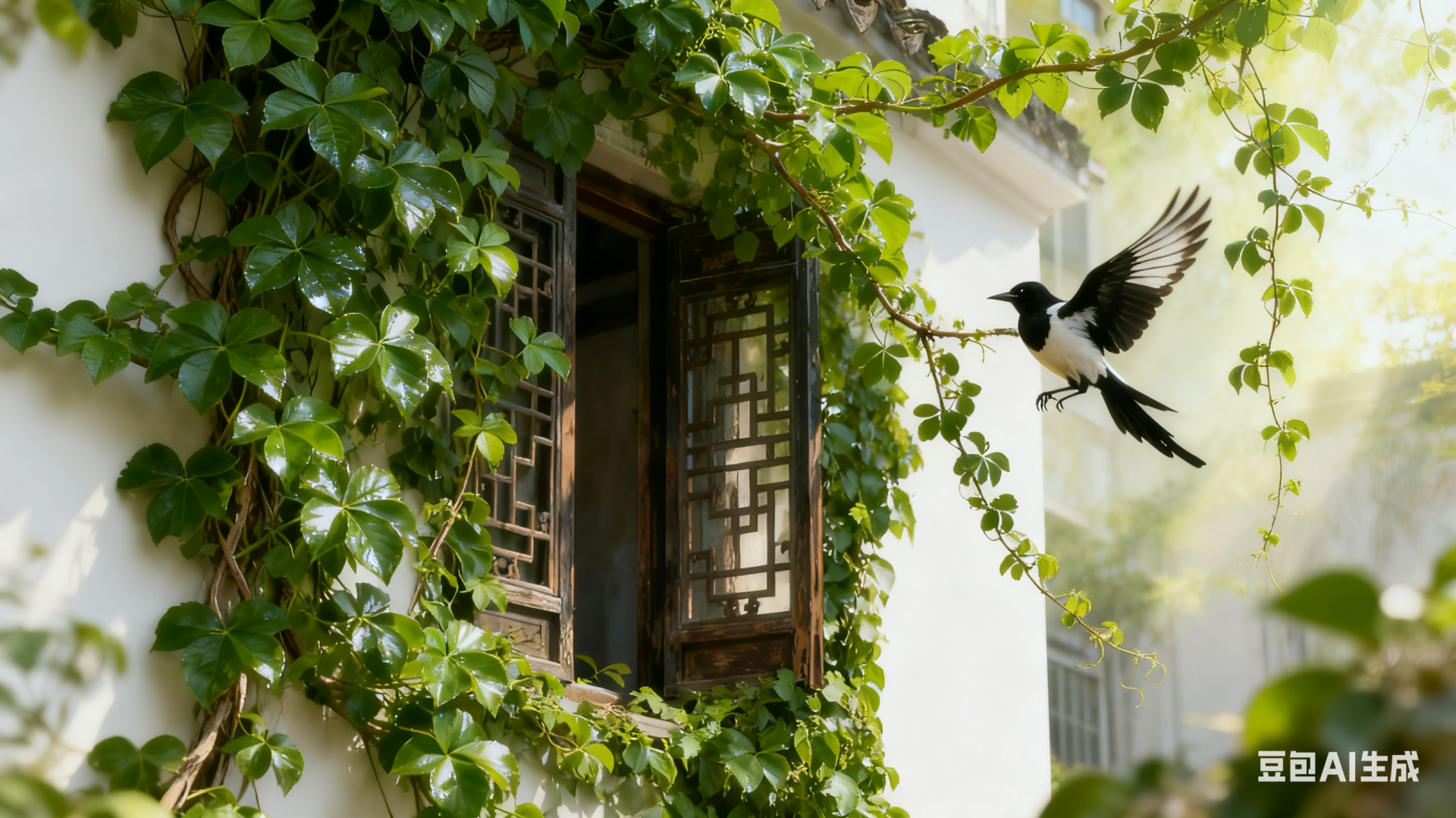 爬山虎看到喜鹊,叶片轻轻晃动,叹息道:“比起它,我的根只能困在这里,和你的禁锢并无两样。”窗框上的铁锈如岁月留下的皱纹,低声应着:“昨夜秋风说,你的红叶该落进书页了。”藤蔓沙沙作响,语气里带着期许:“那正是我想要去的远方。”