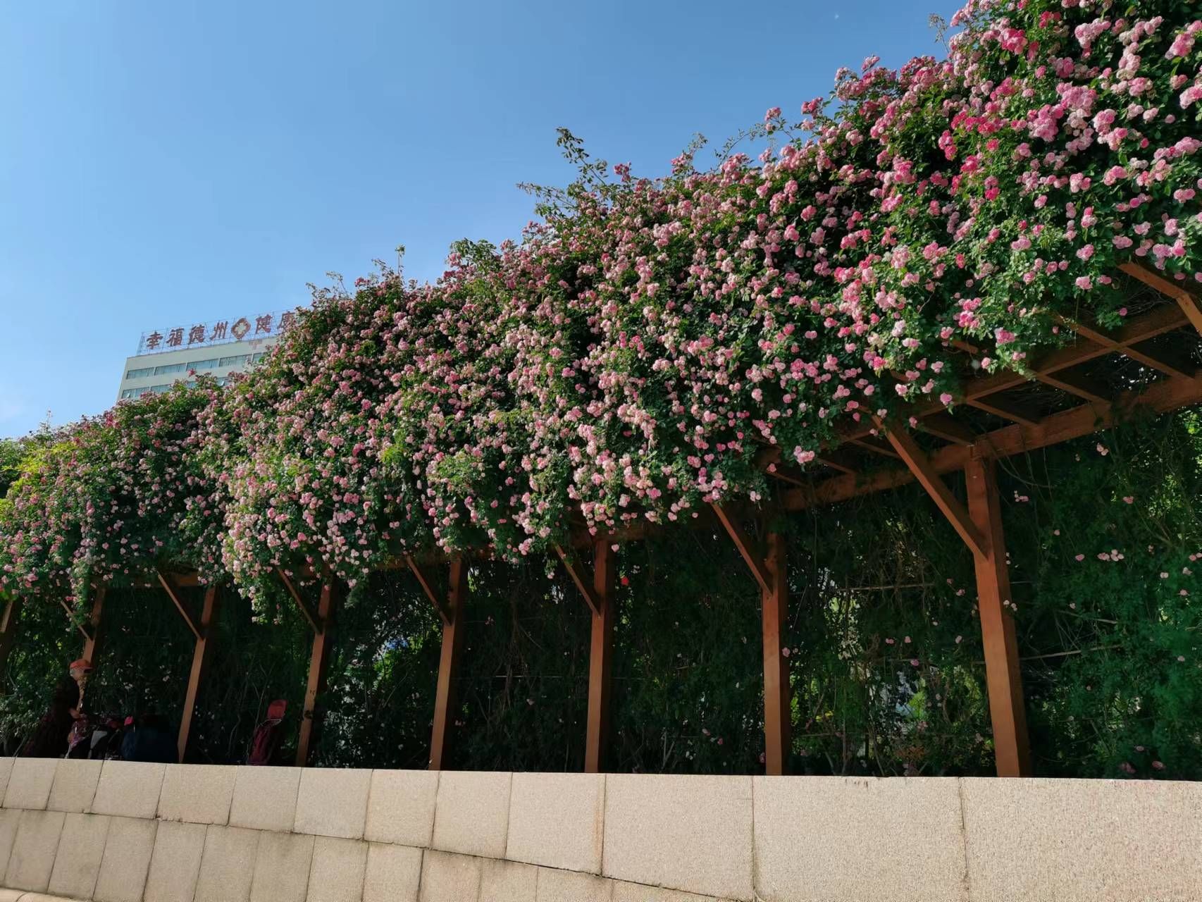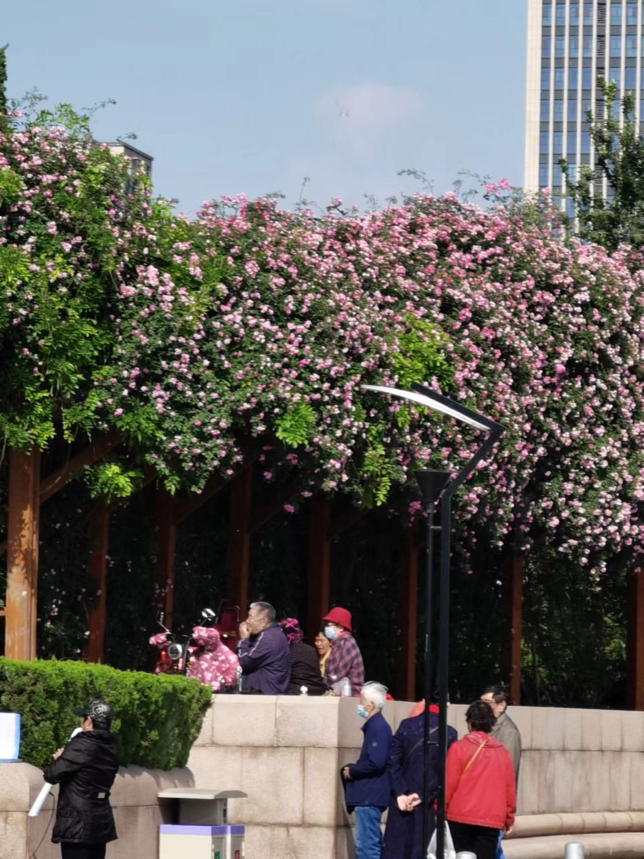 这是什么花?我穿过那些唱歌和弹奏的人群,站在花架下,举起手机让“识花君”为我辨别:“七姊妹花”,好神奇的名字!我又查了一下资料,原来这个花是蔷薇花属,也就是粉蔷薇。因其花朵密集的抱在一起,一簇花多是七至十朵,因此得名“七姊妹花”。一簇簇花朵又密密麻麻的挤在一串串枝条上,架起一个密不透风的花廊。