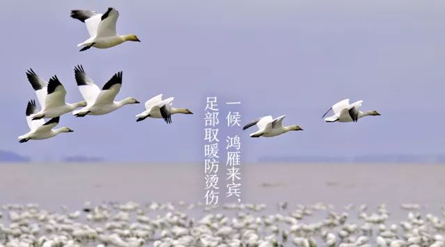 注:①②句寒露三候。一候鸿雁来宾,鸿雁大举南迁越冬。二候雀入大水为蛤,天寒海边多现蛤蜊,贝壳条纹颜色与雀鸟极似,古人认为是雀鸟入海而变。三候菊有黄华,此季节菊花盛开,一花开时百花杀。