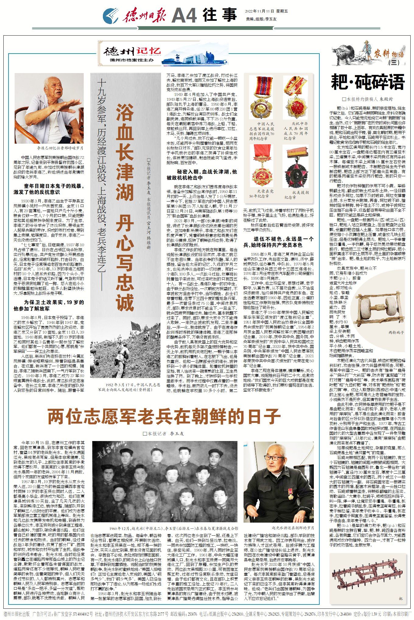1957年3月,19岁的赵光水从家乡光荣入伍,20公里之外的新盛店镇西李官屯村同样19岁的李玉贤也同时入伍。二人都是高小毕业,很快成为知己。他们在夏津县城训练10天后,坐了几天几夜的火车,来到鸭绿江边,稍作休整,随部队开到了朝鲜三八线附近的平康。他们成为志愿军某部独立营工程机械连上等兵。赵光水和几位战友携带发电机和电锯,到森林为各单位伐木,李玉贤则被分到通信工程连,翻山越岭,为部队架设通信线路。他们住着自己修建的营房,吃的用的都是国内运过去的粮食和物资。当时的朝鲜,经过停战后3年多的建设,恢复了部分厂矿、医院和学校,城市和农村开始有了生机,但战争的创伤远未愈合。赵光水说,当时他经常看到矗立在道路两旁那些山坡上的烈士纪念碑,默默怀念着那些未曾谋面的战友。道路两旁还有不少炮弹坑,朝鲜人民吃着简单的食物,住着简陋的房子,但人们天天像过节似的,人人都特别高兴。志愿军和朝鲜人民及人民军特别亲。志愿军当时的口号是“多流一把汗,多留一分友谊”,帮助朝鲜人民进行各种劳动,当地群众有什么需要,部队就毫不犹豫地去做。朝鲜人民也给志愿军送蔬菜、物品。每逢中、朝各种纪念节日,都要互相祝贺、开展联欢活动。赵光水和李玉贤虽在一地,却不是一样的工作,天天从白忙到黑,根本没有见面的机会。辛苦自不必说,危险却时时摆在面前。有一次,赵光水连队的司务长上山给牲口拔草,不幸踩到地雷牺牲。说起当时的抗美援朝战争,赵光水斩钉截铁地说:“美国人怕咱们!正如毛主席他老人家说的,美国人‘钢多气少’,我们‘钢少气多’。美国人已经给那场战争下了结论,认为那是一场他们永远打不赢的战争。”