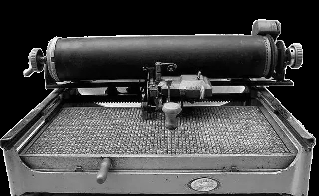 这是一台长方形的打字机,有滚筒、铅字盘和机头三大部分组成。打字机上方的滚筒是用来卷放蜡纸的,底座是一个长方形的铅字盘,由一个个小方格组成,方格内密密麻麻的镶嵌着一排排钢字,每一个钢字都可以用小镊子拿出来调整顺序,滚筒前面衔接的部件是机头,安装在机头上的字锤可以前后左右移动,在铅字盘里找到需要的钢字后,对准字盘把手柄向下一按,字锤衔住铅字盘里的钢字,“啪嗒”一声向上打到滚筒的蜡纸上,又瞬间放回到铅字盘的原处。这样一排排打印出来的文件,字体、字形都是一样大小,排版整齐、字迹清晰,比上学时老师手工刻写的要规范的多。