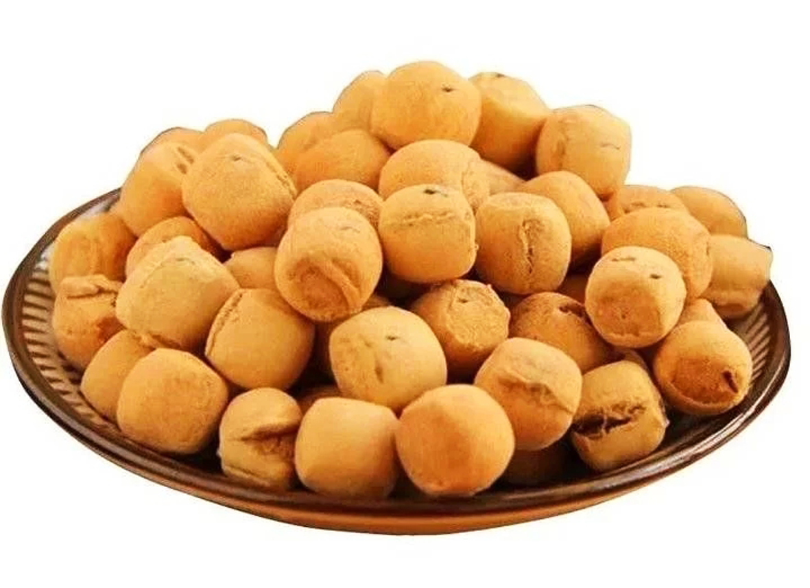 接下来的制作工序是揉面,要反复地把面揉均匀,然后抻成很长的一根面条,用刀剁成琪子块,再用双手充分揉搓变成一个个圆润可爱的小面蛋,如此一来“土里蹦”坯子便成形了。家里做饭的主妇个个是炒小面蛋的“老把式”,这个时候开始拉风箱烧柴火,用来预热大铁锅里的沙土。火候到了沙土就变成褐色。趁热把小面蛋倒进锅里滚烫的沙土中,不停地用铲子来回翻炒。这可是个功夫活,小孩子最爱看的就是这个场景,因为“土里蹦”就要翻跟斗出锅了。儿时的我喜欢站在灶前,睁大了眼睛看着锅里的沙土演绎一场神奇的流水画面:高温下滚烫的沙土此刻如汩汩泉水在流动着,小面蛋们簇拥着、翻滚着、奔腾着,如“龙抬头”的心情欢欣雀跃,后来长大了才明白,那流动的沙子只是一种视觉现象而已。炒制到小面蛋逐渐变成了焦黄色,便大功告成。刚出锅的面蛋太烫且还是外酥里软,待到彻底晾凉后,才是传说中那咔嘣响的“土里蹦”,咬在嘴里品尝第一口酥脆,好吃到无法用语言形容,内心的幸福指数也一路飙升。这一刻你不得不叹服家乡人,传承利用沙土的文明智慧,发明了这远近闻名的“土里蹦”。