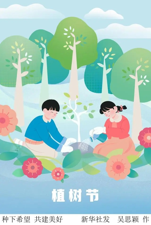 禹域阳春,歌飞北岭,旗展南山。看荒沙植树,烟汀点翠;鸟鸣江岸,枝蔓郊阡 。继踵鸿原,摩肩乡郭,新绿丛篁遍九川。待明岁,喜琼林玉树,朗丽尧天。