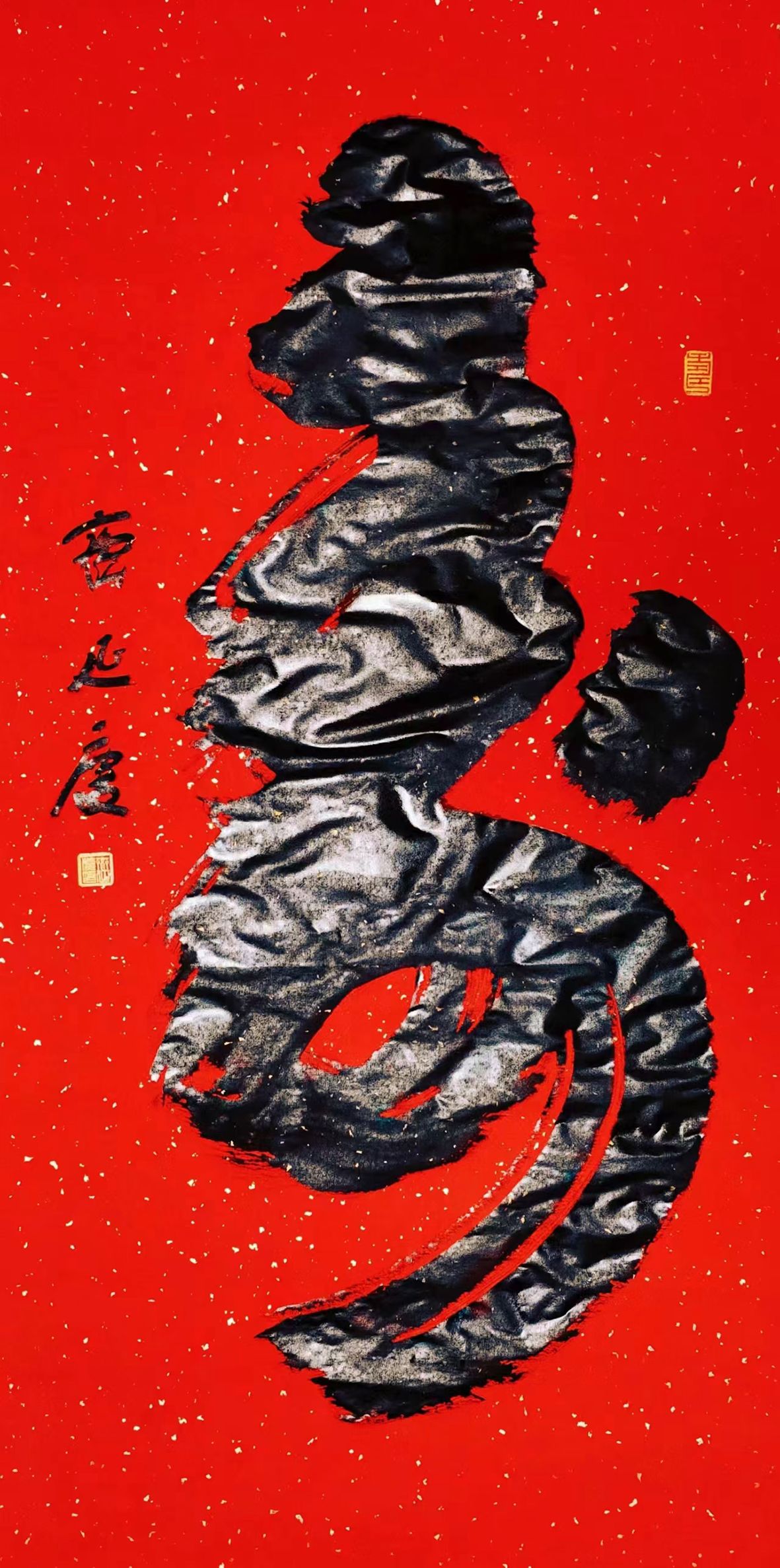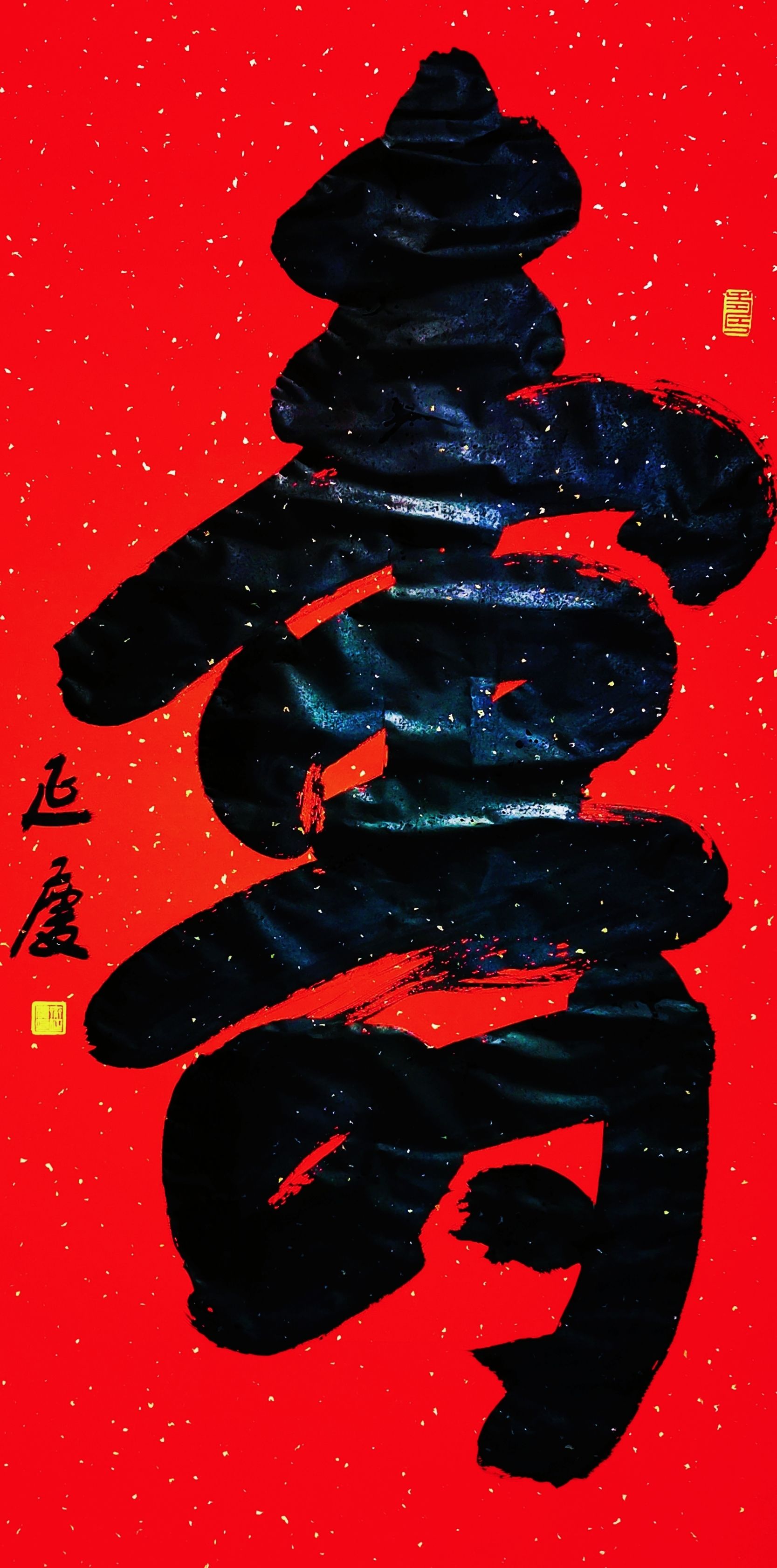 舒体传人齐延庆,是中国舒体八俊之一,先生研习书画和舒体长达40余年。在榜书创作方面更是颇有造诣,看先生榜书寿字,会使你感到更加出神入化。他胸有成竹,执牛耳大笔,浓墨随心,几番转承,透彻酣畅的榜书寿字便跃然纸上,笔画简劲蓬勃,承转起合自然和谐,纸墨间透露出盎然生机,一入眼就给了我们姿容秀挺、福韵绵长的舒体美感。近日欣赏到齐先生的两幅榜书寿字,会让人明显地感受到既有相同之处,又有着不同之美感。