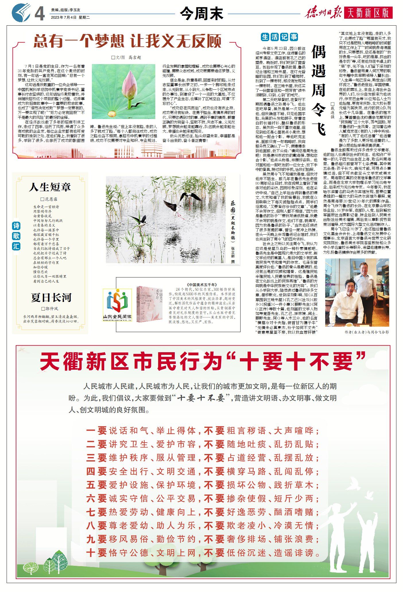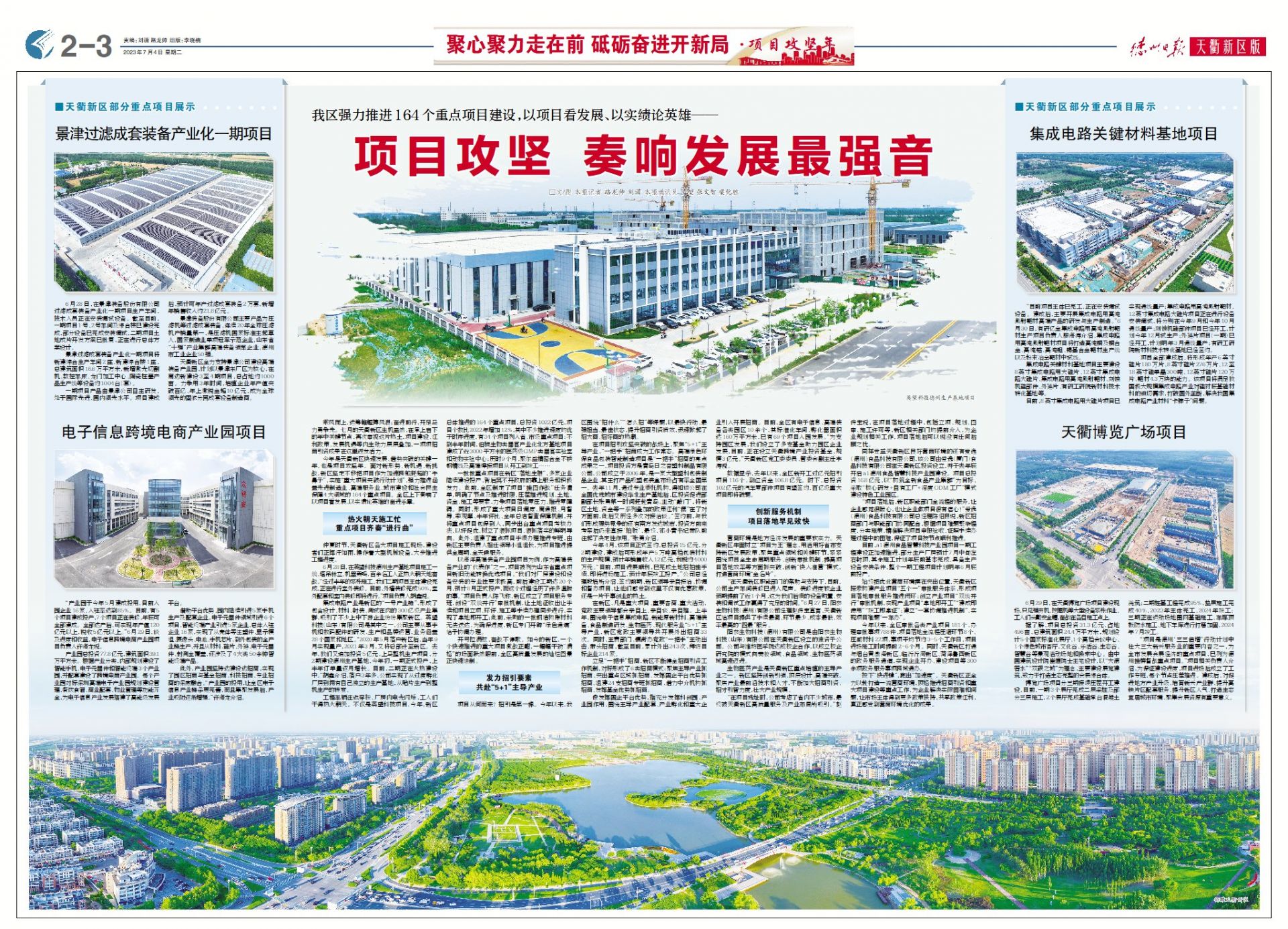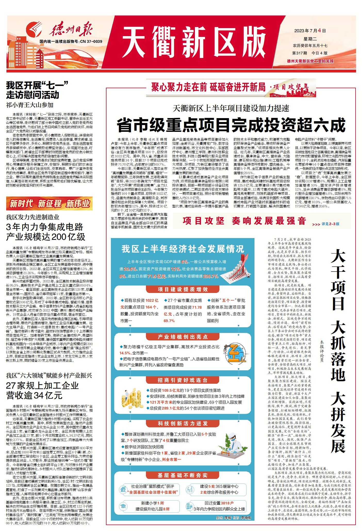 德州天衢新区新闻周报(6月23日至7月4日) ©原创 2023-07-04 09:40 德州日报 0 ▶省市级重点项目完成投资超六成!德州天衢新区上半年项目建设加力提速。(点击查看详情) ▶德报评论 | 大干项目 大抓落地 大拼发展。(点击查看详情) ▶德州天衢新区开展“七一”走访慰问活动(点击查看详情) ▶ 蹲点深壹度 | 天衢新区:项目攻坚 奏响发展最强音。(点击查看详情) ▶今周末|总有一个梦想 让我义无反顾(外三篇•首)。(点击查看详情) 德州日报新媒体出品编辑|刘潇审核|钟伟 终审|尹滨 (作者:德州日报)