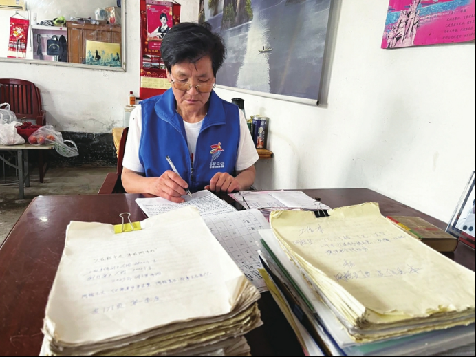 “因为下雨刮大风,村东头一处闲置房房顶被吹倒的大树砸坏,房顶上的瓦片摇摇欲坠非常危险,紧急联系村‘两委’后,下午3点左右对闲置房加装了铁皮,避免了危险发生。”5月27日晚上,齐河县仁里集镇田西村网格员杨昭荣像往常一样坐在家中书写着当天的网格工作日志,整洁的书桌桌面上摆放的一本本泛黄的日志本引人注目。