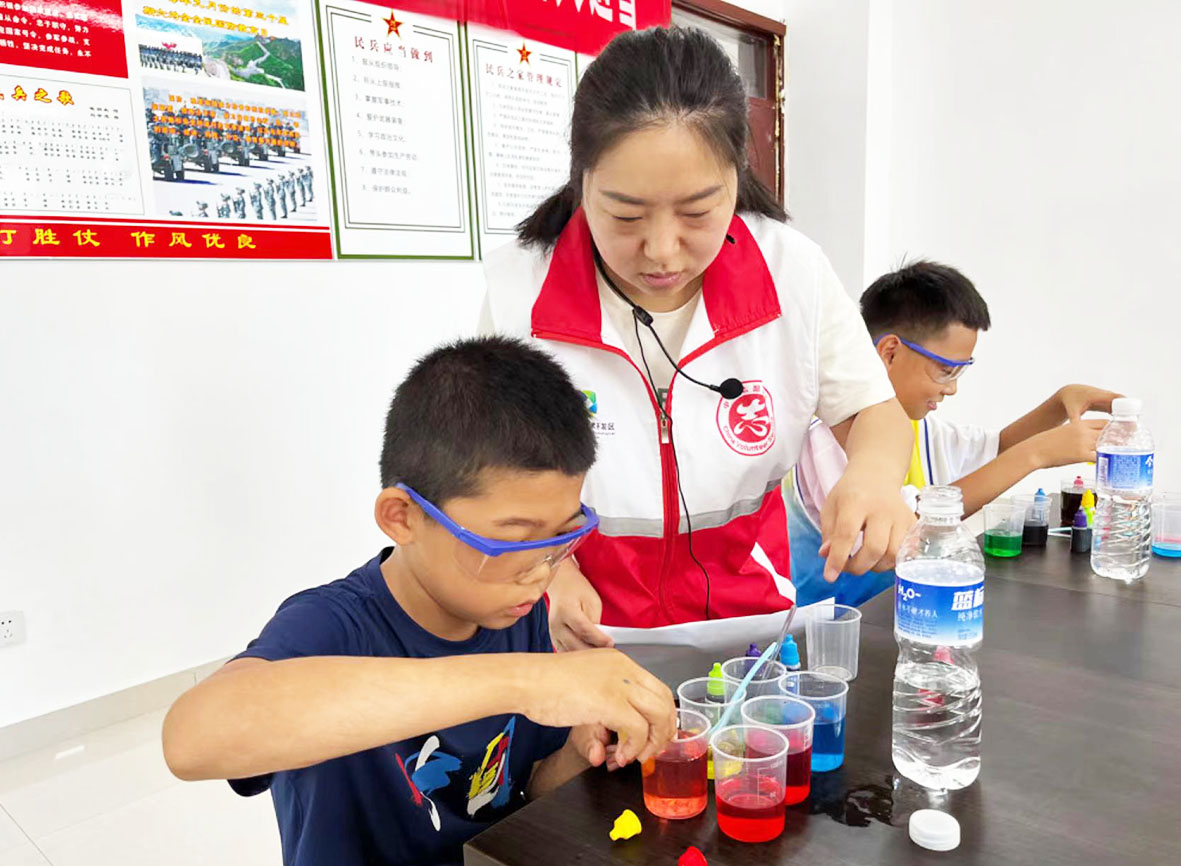 7月17日,天衢新区宋官屯街道开展“筑梦”公益夏令营活动,本期活动志愿者为孩子们演示了人造雪的制作过程。