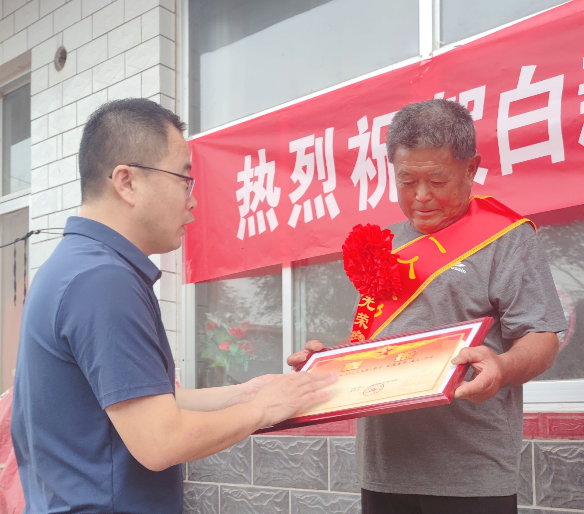 近日,铁营镇党委副书记、镇长刘洪刚带队上门为辖区立三等功的现役军人送喜报。在白新宏家中,慰问组一行为立功军人及军属戴上绶带,送上喜报和慰问金,并详细询问其家庭情况和生活状况,嘱咐他们有困难、有需求随时联系镇退役军人服务站,党委政府会尽全力帮助。