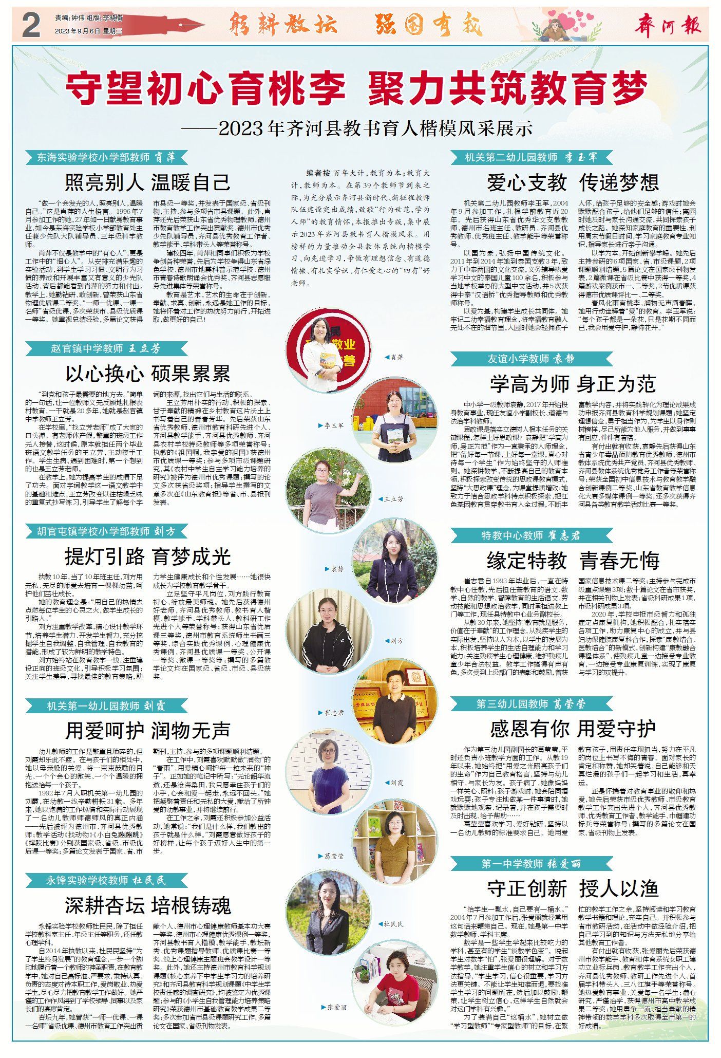 齐河县新闻周报(8月31日至9月6日) ©原创 2023-09-06 09:11 德州日报 0 ▶投资18亿元!齐河一中生态城校区投用。(点击查看详情) ▶网评|齐河:一流教育成就一流城市。(点击查看详情) ▶2023年齐河县教书育人楷模风采展示。(点击查看详情) ▶齐河县万余名小学新生入学丨多彩活动点亮开学“第一课”。(点击查看详情) ▶齐河县妇联开展“齐润童心·爱心妈妈”系列活动丨呵护困境儿童 用心陪伴成长。(点击查看详情) ▶公益丨预防未成年人网络沉迷 德州日报新媒体出品编辑|李晓楠审核|钟伟 终审|尹滨 (作者:德州日报)