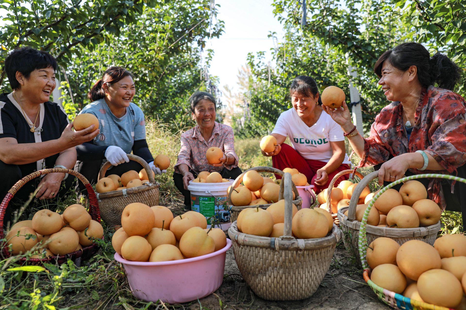 9月15日,乐陵市铁营镇大白张村村股份经济合作社皇尊蜜梨种植基地内,社员们在采摘皇尊蜜梨。