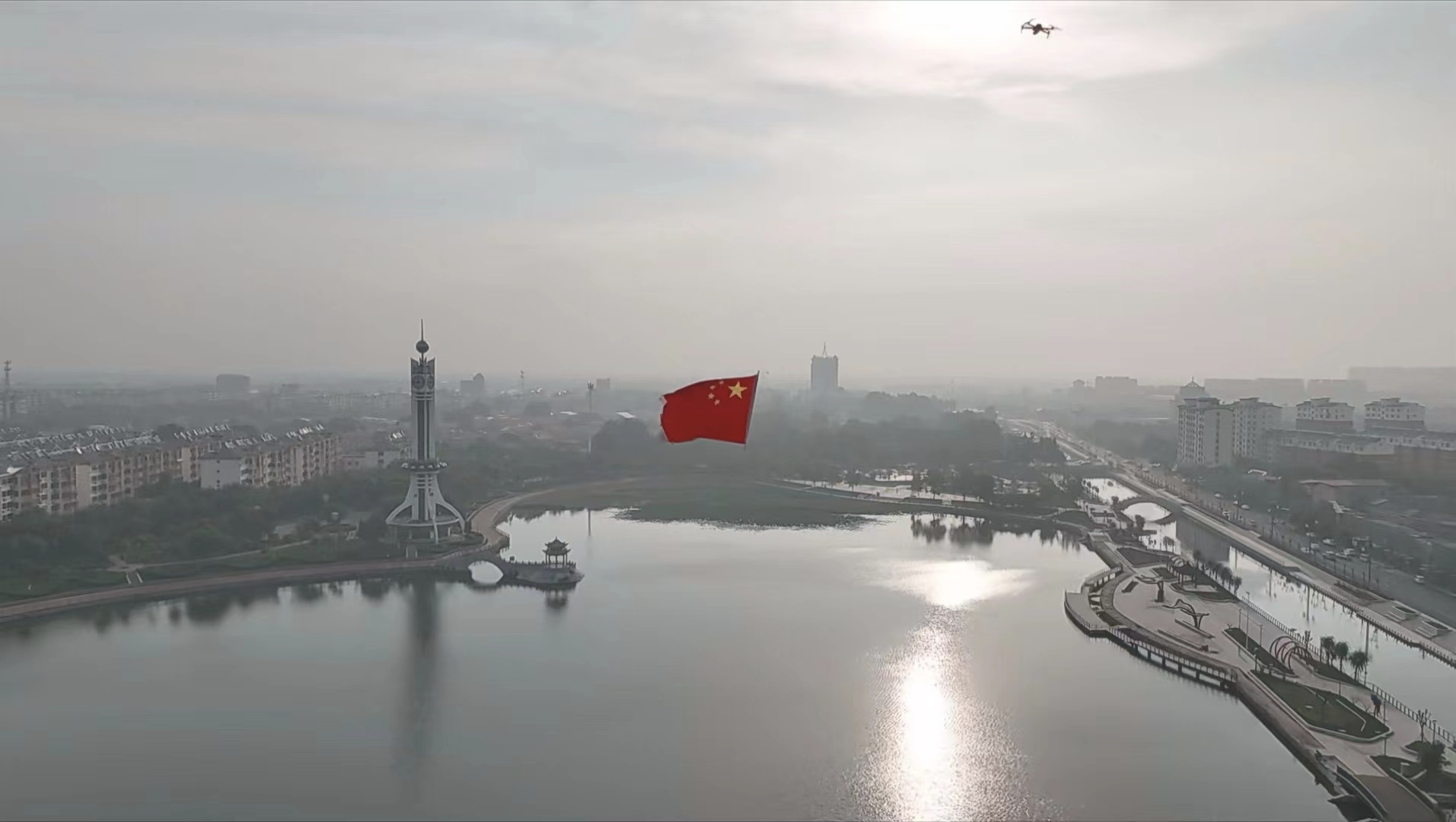 9月28日,无人机悬挂着国旗缓缓升空,从城市中心飞向马颊河畔、从元宝湖飞向冀鲁边湿地公园,引来许多市民驻足拍摄。