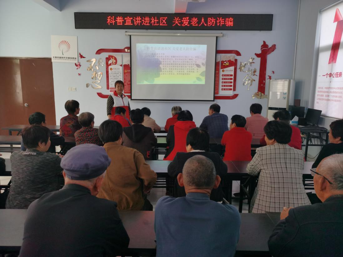 10月23日,在重阳节到来之际,为提高老年人防范诈骗意识和能力,天衢新区抬头寺镇在大韩社区开展重阳节“科普宣讲进社区 关爱老人防诈骗”宣讲活动。