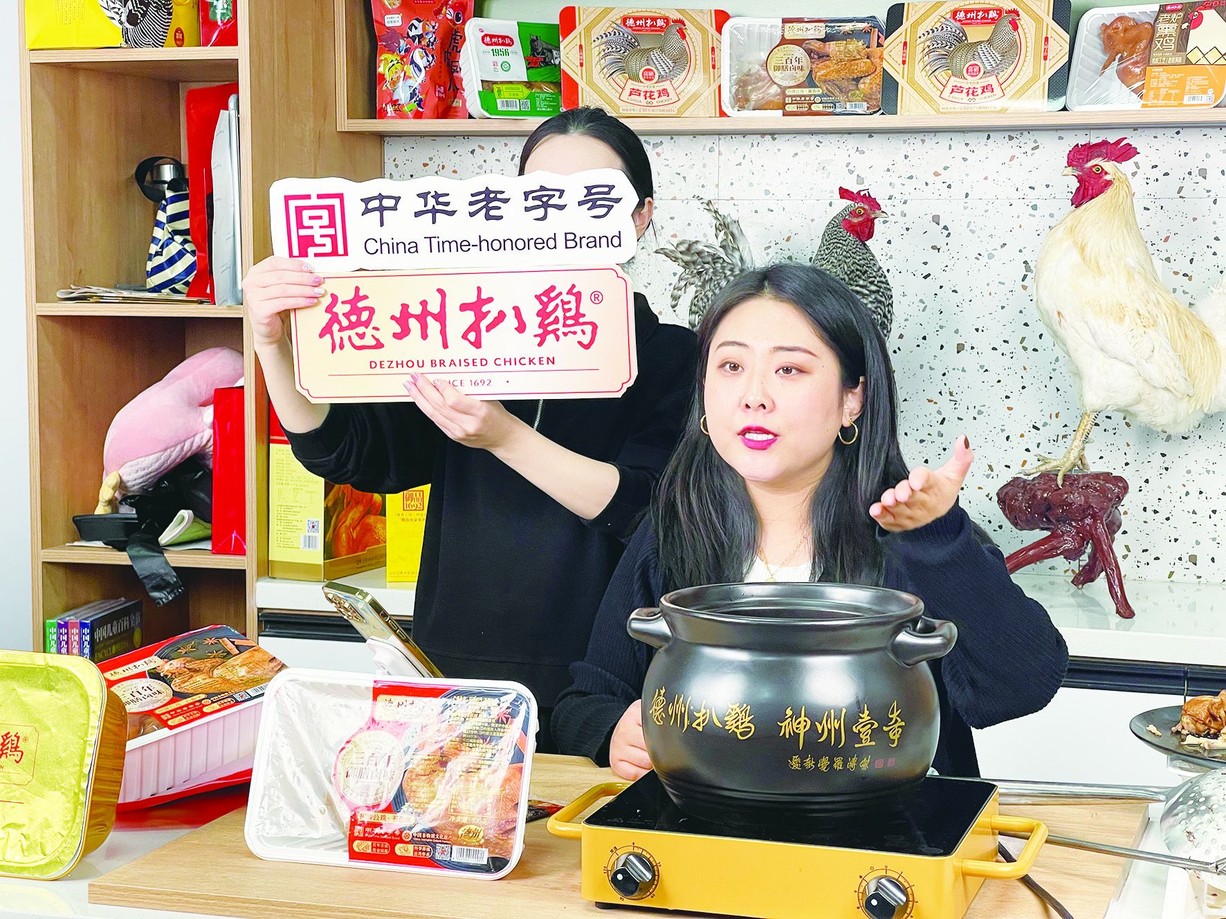 “宝子们,今天我为大家推荐了几款经典产品。瞧这款招牌扒鸡,口感外酥里嫩,而且有多种吃法……”11月7日,处于决战“双11”关键期,德州扒鸡股份有限公司启动列车情怀直播专场。直播间内,主播张笑颜一边对着高光镜头展示产品,一边讲解着历史渊源、制作工艺、食用技巧。一旁的助手在她的指挥下,将一件件产品在网店中“上架”,供直播间看客选购。