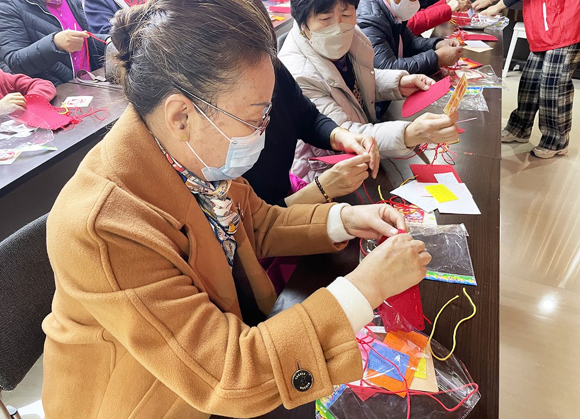 在社区活动室内,志愿者一边为老人们分配制作材料,一边为大家讲解福袋的由来和寓意。“请大家将手中的材料包打开,里面有制作福袋所需要的针、线和布料……”按照志愿者介绍的制作步骤,居民们一边穿针引线,一边互帮互助,共同体验着制作福袋的乐趣。在一片欢声笑语中,一个个精巧的福袋很快便缝制完成,看着自己亲手制作的福袋,每个人的脸上都洋溢着笑容,非常有成就感。