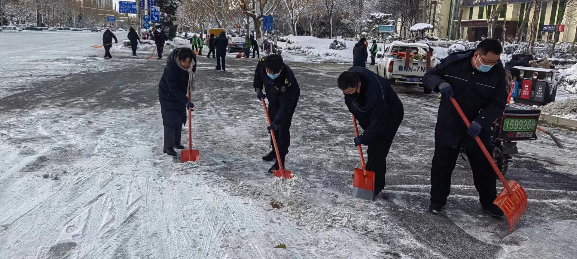 大雪来临后,市城市管理局天衢新区分局遵循“有障必除、无障消患”的目标要求,通过倾斜巡查力量、增加巡查频次的方式安排队员加强辖区道路巡查、排查积雪急需清理的重点路段、及时发现各类突发问题。针对行道树树木倒伏、折枝险情及时联系相关部门,协助处理,避免给过路行人和通车辆造成危害。同时城管队员拿起扫把、雪铲,和商户、社区工作人员一起开展“扫雪铲冰”。