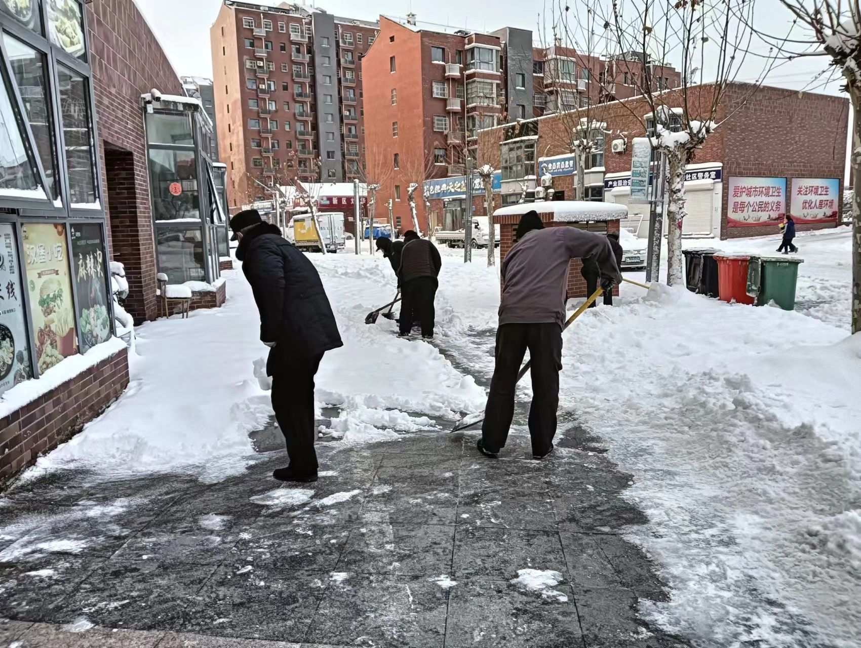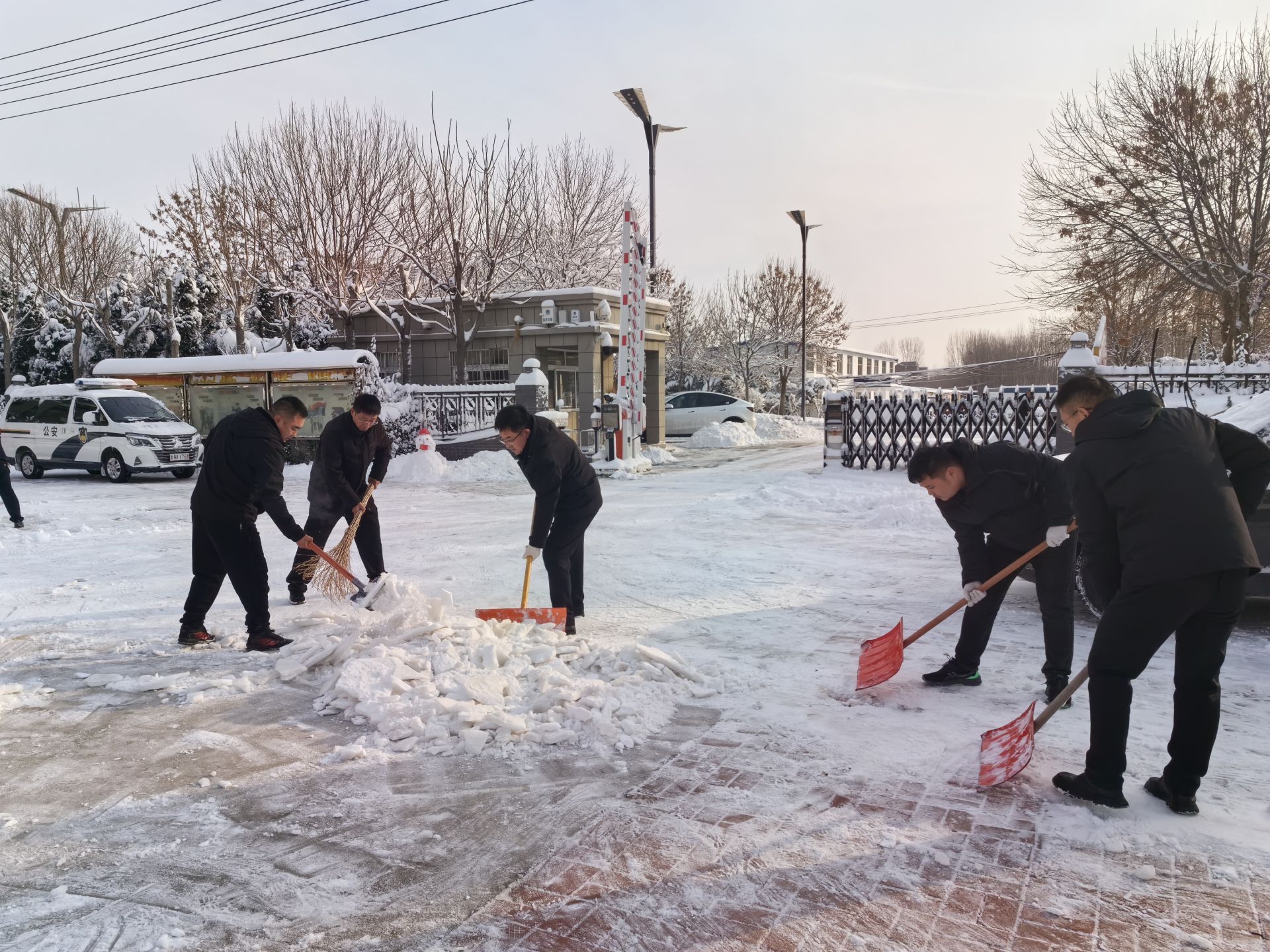刺骨的寒风也阻挡不住辖区机关干部为民服务的脚步。只见,班子成员、机关干部们手持铁锹、扫帚、簸箕,对机关驻地的积雪进行清理,他们有的铲、有的扫、有的推,大家团结协作、配合默契,干得热火朝天。同时,各村干部、物业工作人员、网格员也纷纷开着铲车,拿着铁锹,对村庄、社区的主街干道、重要交通节点、背街小巷、房前屋后进行全面清理,为辖区居民开辟出一条又一条暖心路、平安路。他们忙碌的身影成为皑皑白雪中一道靓丽的风景线。