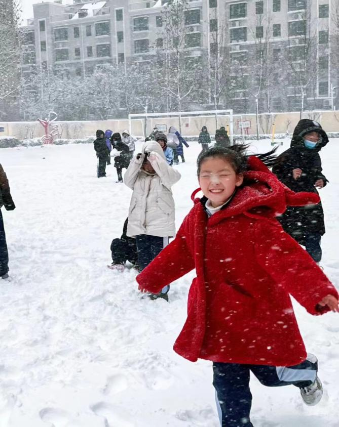 我注意到雪地里有个红色精灵,是她,一个超级乖又有些敏感的小朋友。平日里,她羞涩无比,课堂上,她的声音低到我必须站到她的面前才能听到,作业本上的迷你字体更凸显了她的内秀。现在,她张开双手奔跑了起来,对着我露出了所有的牙齿,爽朗的笑声穿过风雪来到我的身边。我轻声唤她慢一些,担心她会摔倒,但她丝毫没有感受到我的“担心”,自由地跑呀闹呀。我试图放大音量,但是冷风封住了喉咙,不,也许不是冷风,是那份对她自在的欣赏让我安静。
