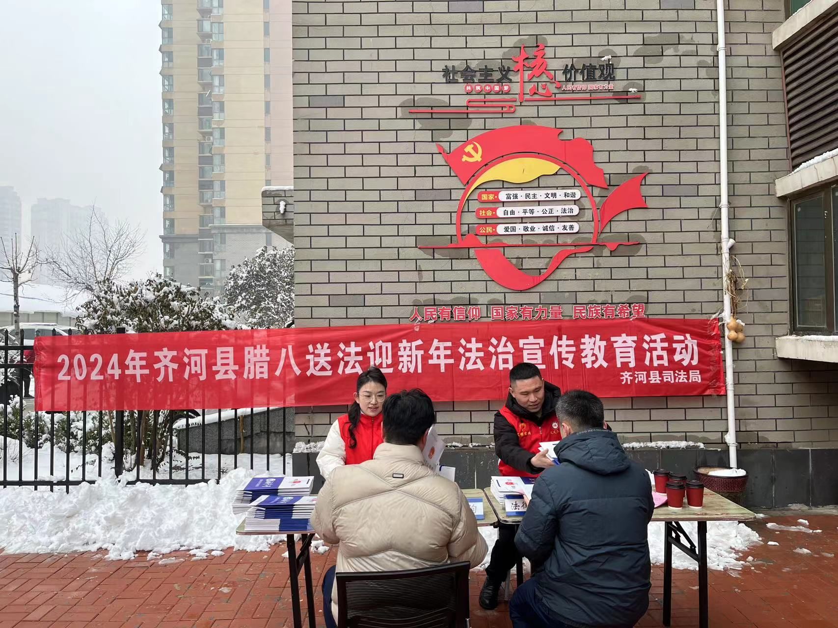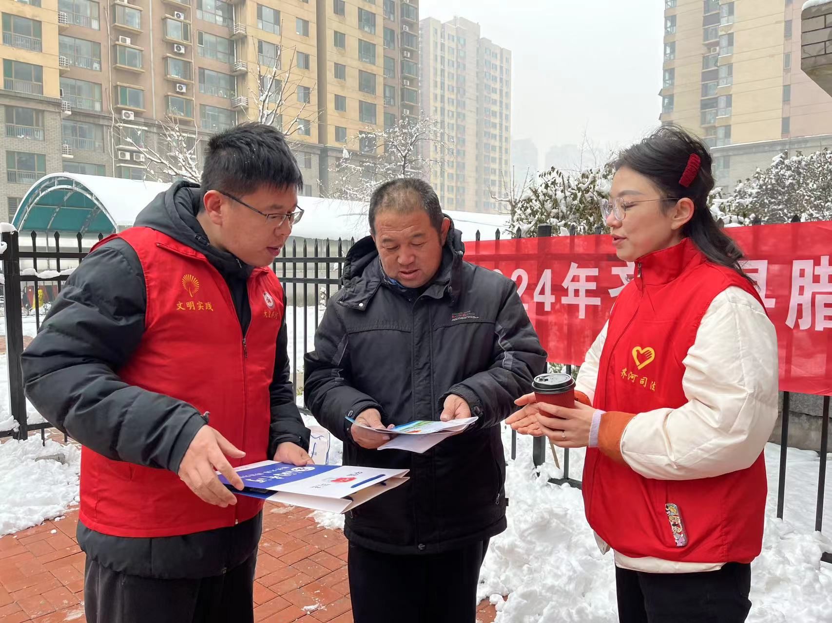 腊八将至,新岁有期。1月17日,齐河县司法局联合晏城街道永乐社区居委会在明珠花园小区开展了以“腊八送法迎新年”为主题的法治宣传教育志愿服务活动。