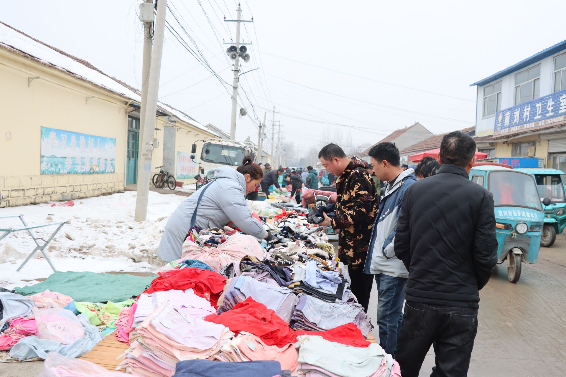 在惠民购物区,只见一个个摊位整整齐齐地摆放在道路两边,不仅有卖各种蔬菜、干果、咸菜等食品的摊位,还有不少卖袜子、衣服、卫生纸等日用品的摊位,新鲜的蔬菜、便宜的价格,很快就被前来赶集的居民围得水泄不通。