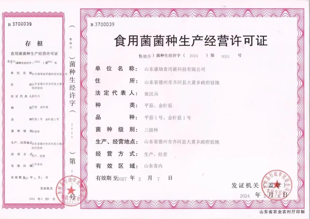 2月8日,齐河县行政审批服务局颁发了德州市首张《食用菌菌种生产经营许可证》(栽培种)。