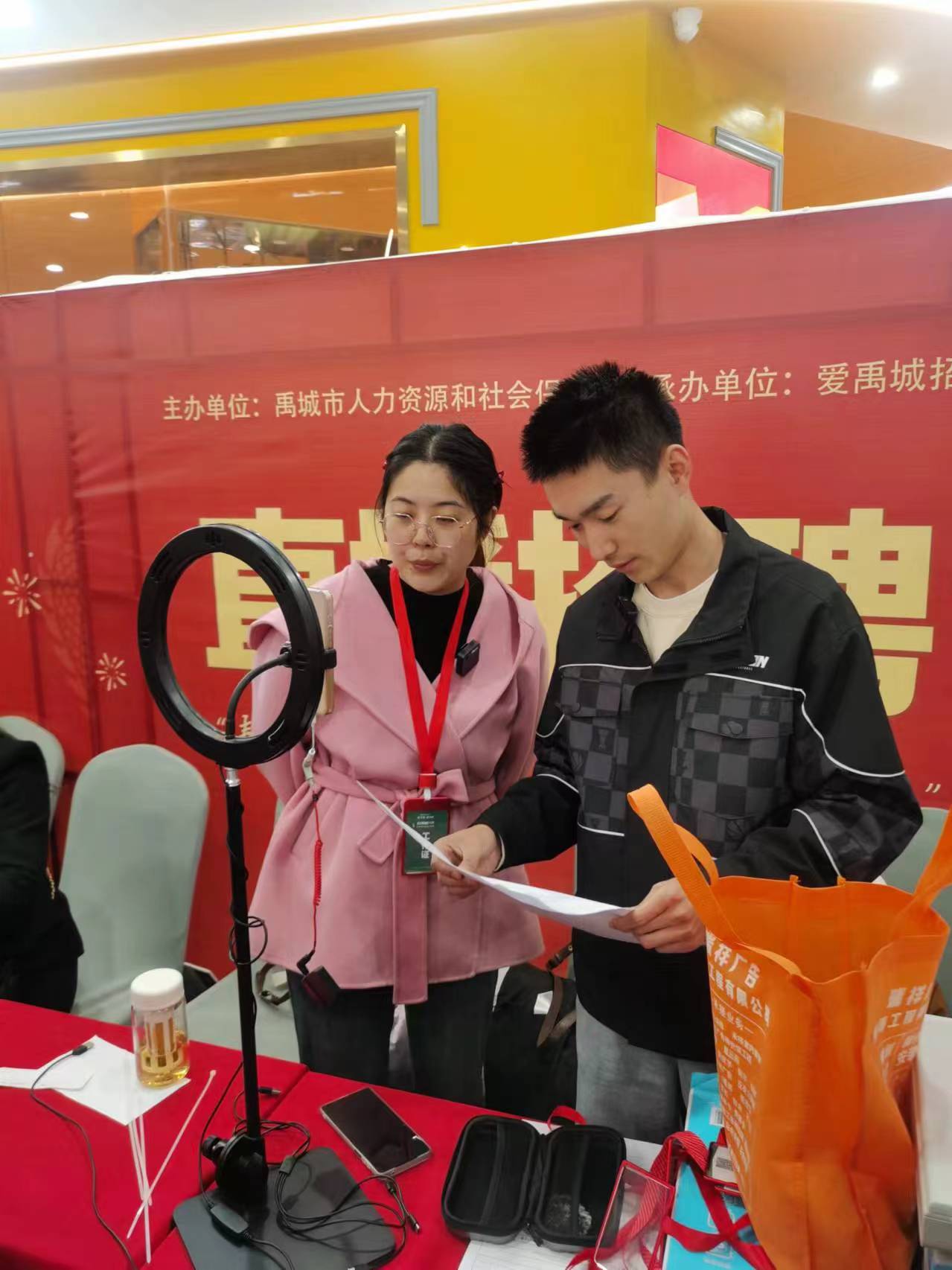 为满足线上求职需求,该市还在现场同步开启直播带岗、走播送岗,承办单位爱禹城招聘网安排专人在微信视频号进行全方位沉浸式直播,通裕、保龄宝等10余家用人企业纷纷进入直播间推介岗位,主播忙碌的穿梭于各个摊位前,尽可能将所有企业招聘信息传递给线上求职者。