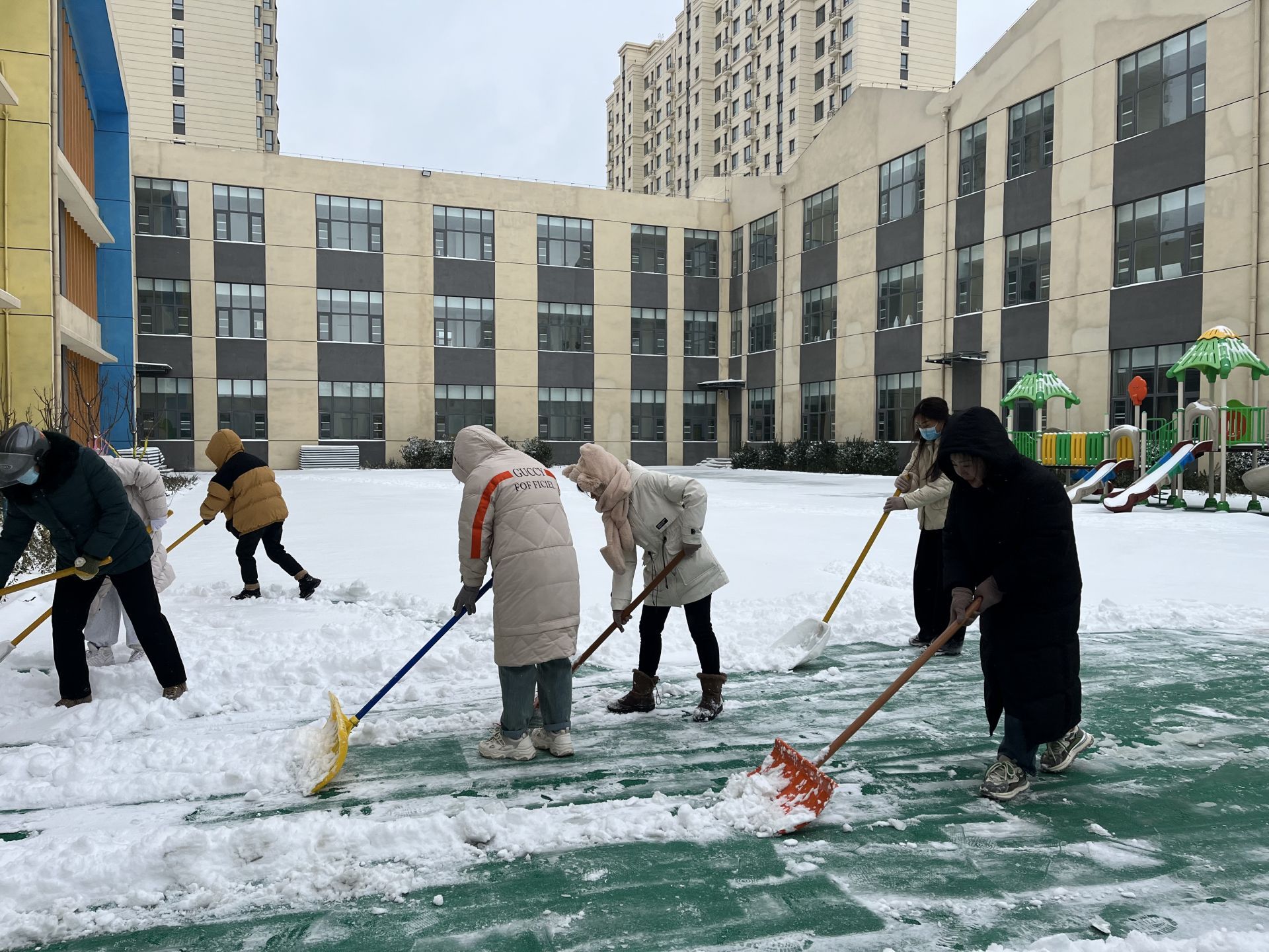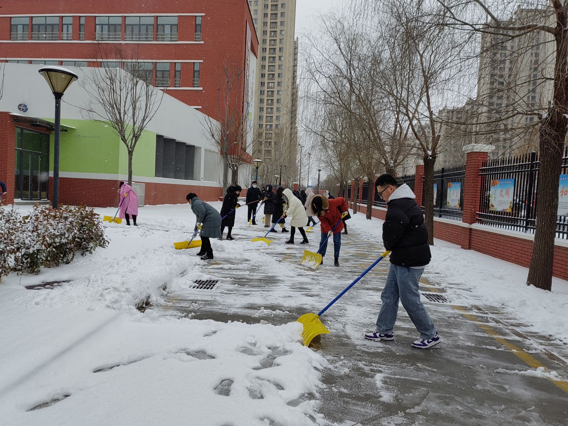 各学校、幼儿园教职工清扫校园内积雪