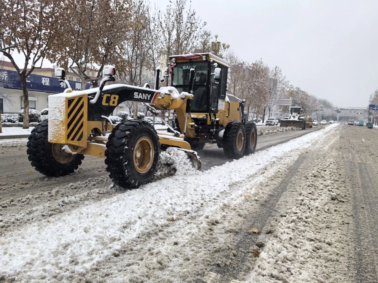 城乡环卫公司人机结合、配合推进,清扫道路积雪