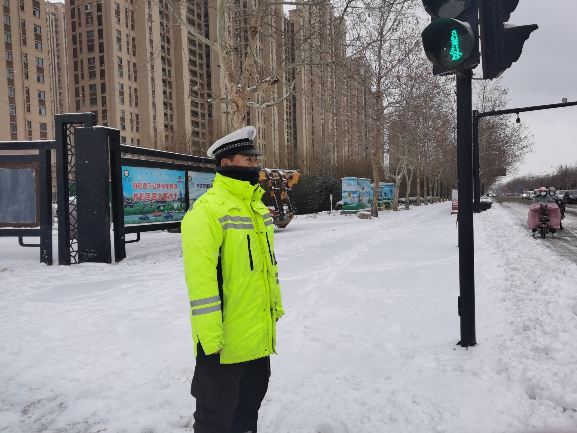交警顶风雪,冒严寒,全力以赴保安全