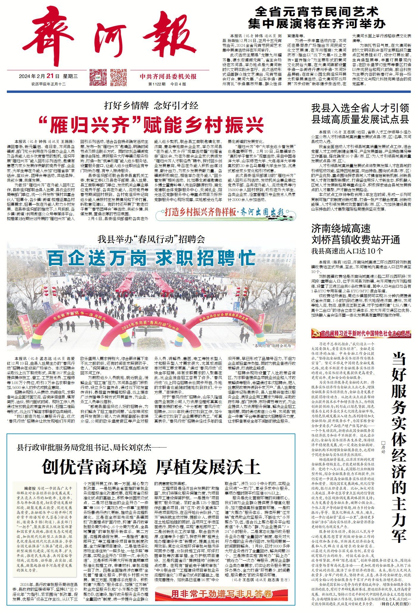▶百企送万岗,齐河举办“春风行动”招聘会。(点击查看详情)