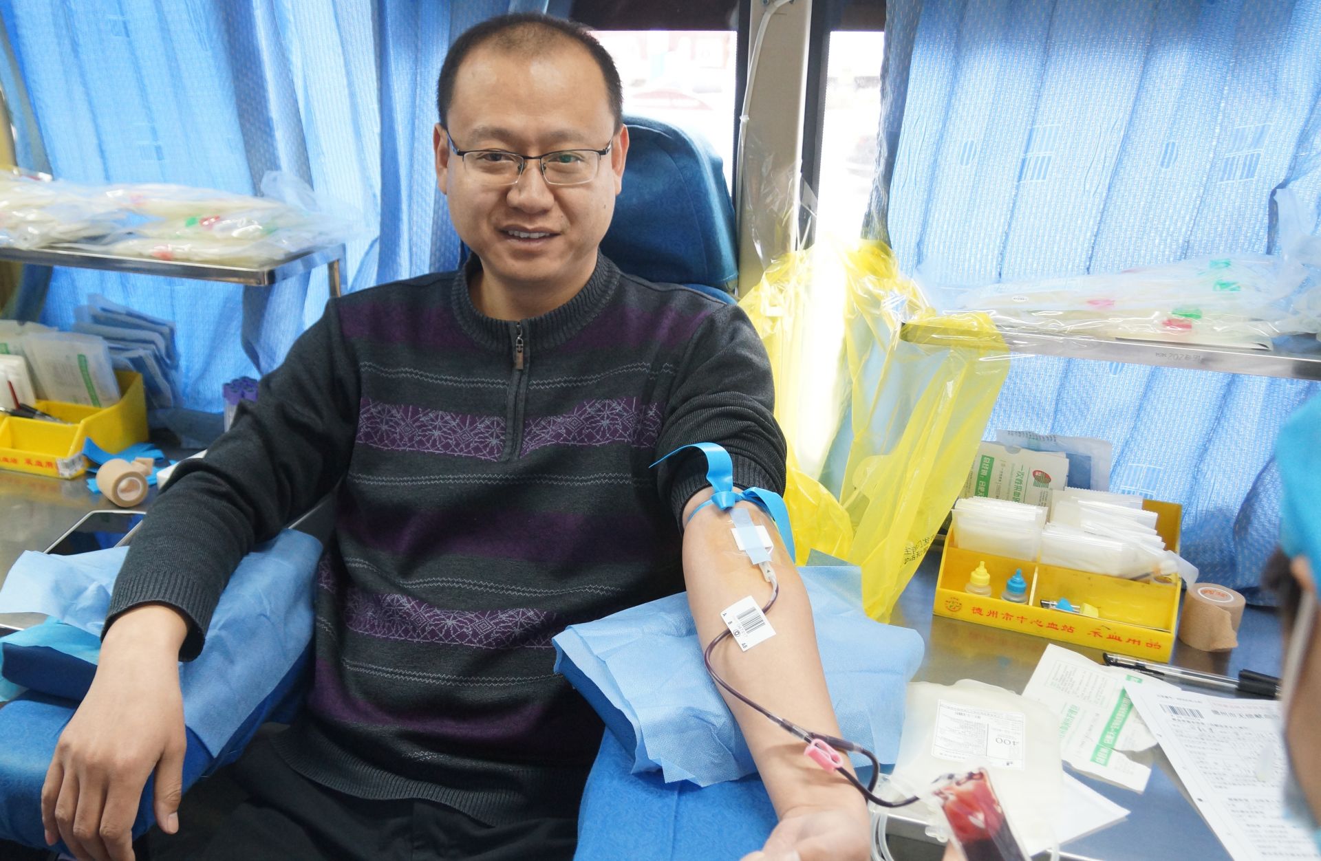 早上8点,尽管天空中飘着蒙蒙细雨,但县卫健系统各单位职工已早早来到县卫健局机关大厅,开始填写登记表,不一会儿,两辆献血车的车门前便排起了长队。县卫健局副局长田新建率先登上了献血车,这是他第4次献血,“无偿献血是一项利国利民的公益活动,这不仅能够帮助别人,还能够促进自身的新陈代谢,是一件非常有意义的事情。”顺利通过验血后,他再次成功献血400毫升。