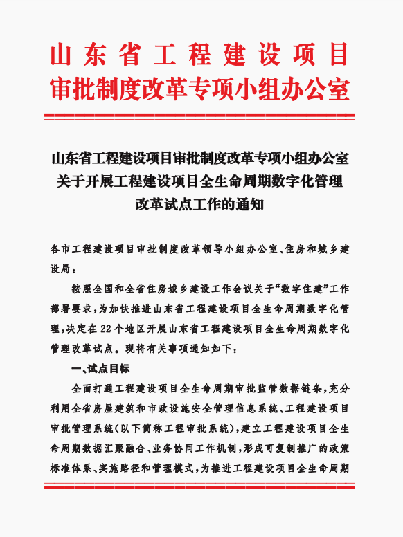 近日,山东省工程建设项目审批制度改革专项小组办公室印发《关于开展工程建设项目全生命周期数字化管理改革试点工作的通知》,决定在22个地区开展山东省工程建设项目全生命周期数字化管理改革试点工作,齐河县入选。