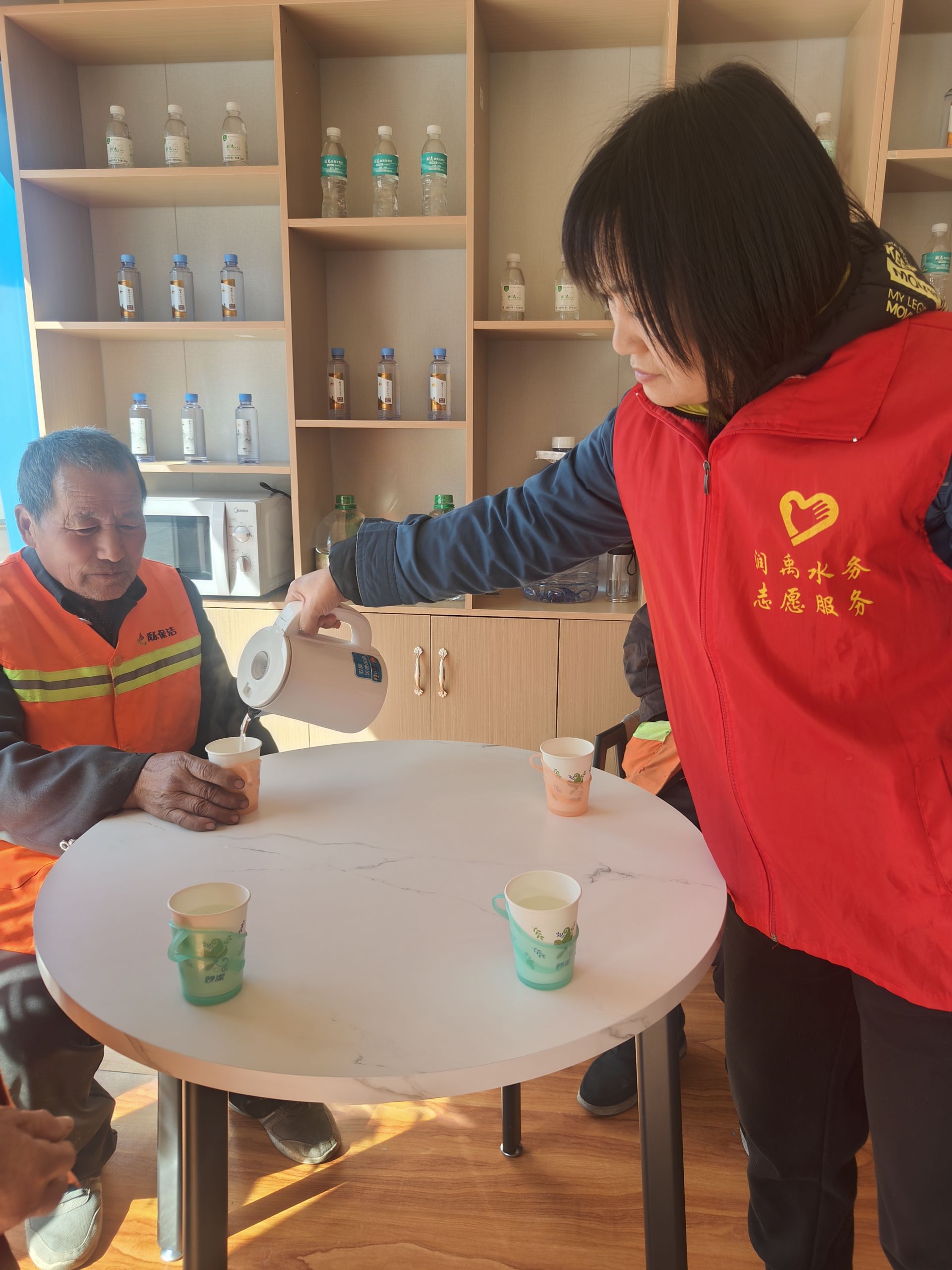 据悉,该驿站是润禹水务公司打造的“润禹商贸便民服务驿站”,开设饮水、休息、就餐、交流学习等功能区域,添置了配套设施,免费向外卖员、快递员、出租车司机、环卫工人等户外劳动者提供休息、饮水、充电等“一站式”便民服务。