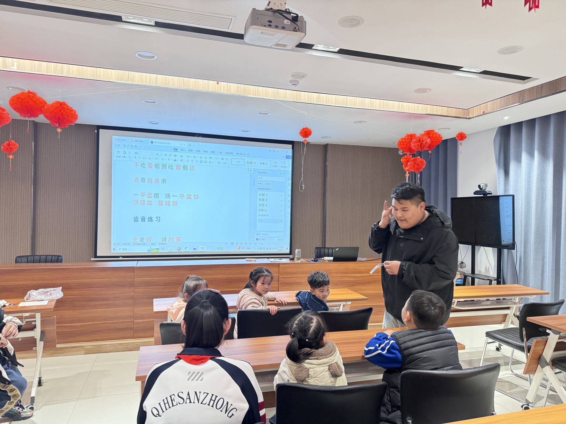 姜天宇通过发音训练、绕口令等学习方式,调整小朋友的语气、语音和语速,纠正错误的发音。练习完绕口令后,带领孩子们练习唇部口部操中的喷唇、咧唇和撇唇。