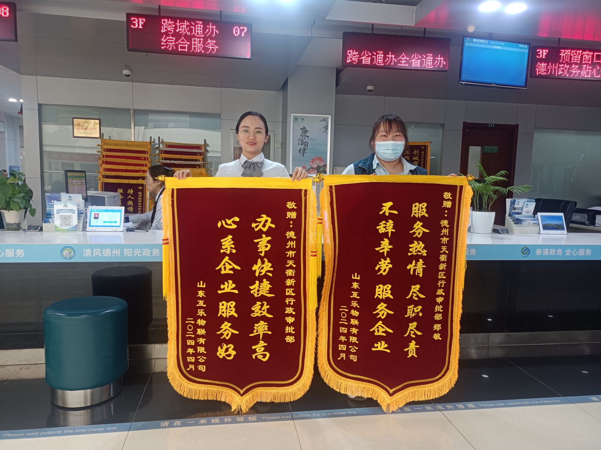 4月9日下午,山东互乐物联有限公司工作人员来到天衢新区政务大厅,将2面印有“办事快捷效率高,心系企业服务好”、“服务热情尽职尽责,不辞辛劳服务企业”字样的锦旗送到区行政审批部企业开办窗口和大厅帮办处,对企业在办理企业开办过程中高效审批服务和热情的帮办服务表示感谢。