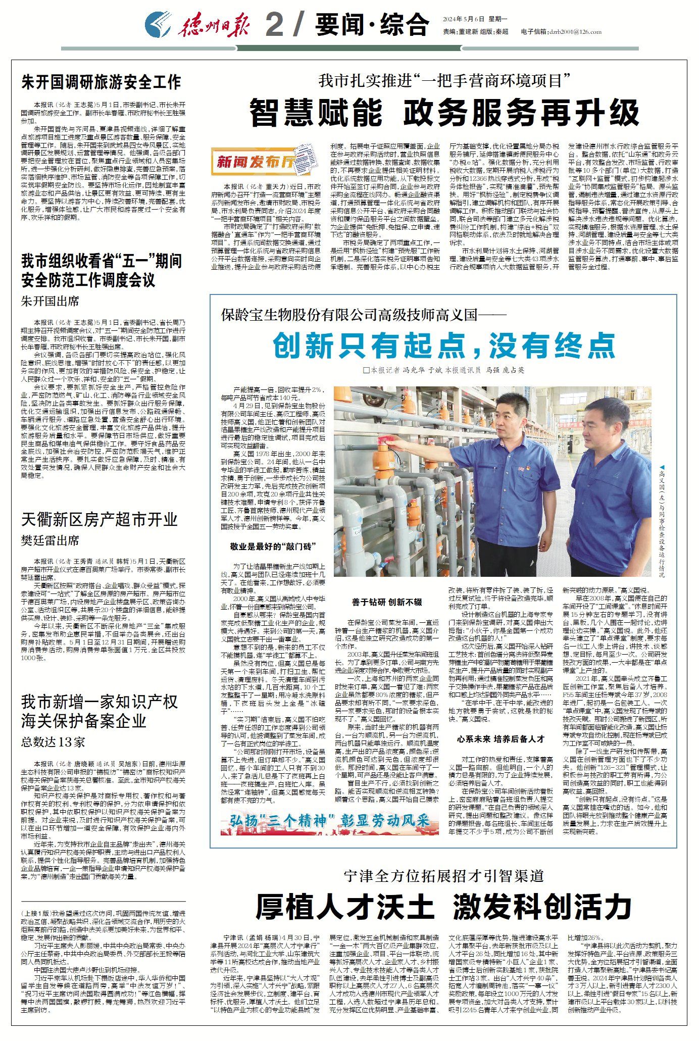 高义国1978年出生,2000年来到保龄宝公司。24年间,他从一名中专毕业的学徒工做起,勤学苦练、精益求精、勇于创新,一步步成长为公司技改研发主力军,先后完成技改创新项目200余项,攻克20余项行业共性关键技术难题,申请专利8个,获评齐鲁工匠、齐鲁首席技师、德州现代产业领军人才、德州创新榜样等。今年,高义国被授予全国五一劳动奖章。