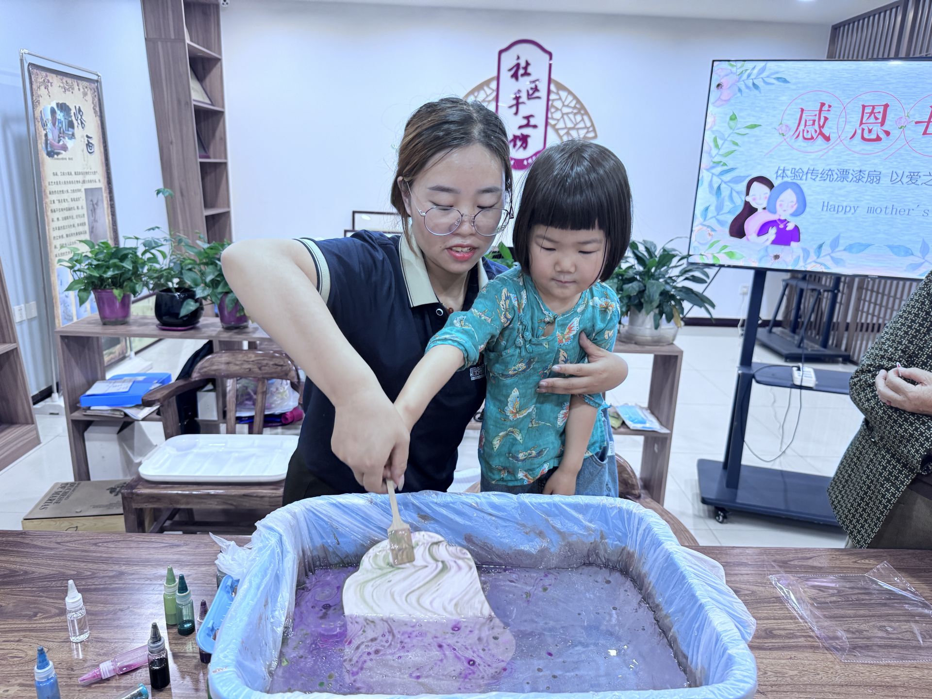阳光一品小区则开展了“非遗传承润指尖”活动,让妈妈们感受中国传统非遗的魅力。活动现场,大家共同制作非遗漆扇。经过调漆、试色后,小心翼翼地将团扇浸入水中,让颜料随水流附着在扇面上,所形成的图案如流云般变幻莫测,大家一同领略了中国传统美学的魅力。