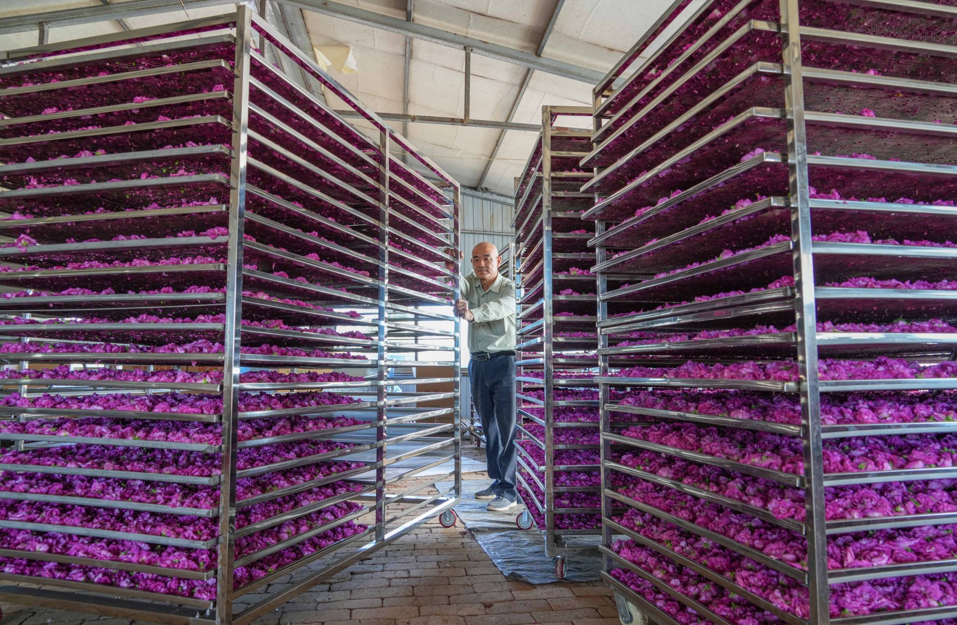 “玫瑰鲜花亩产量通常在1300斤,制成干花也能有300斤。干花的市场价格常年不低于40元一斤,算下来每亩地收入能过万。”提到玫瑰花种植,房富民的语气中满是期许。
