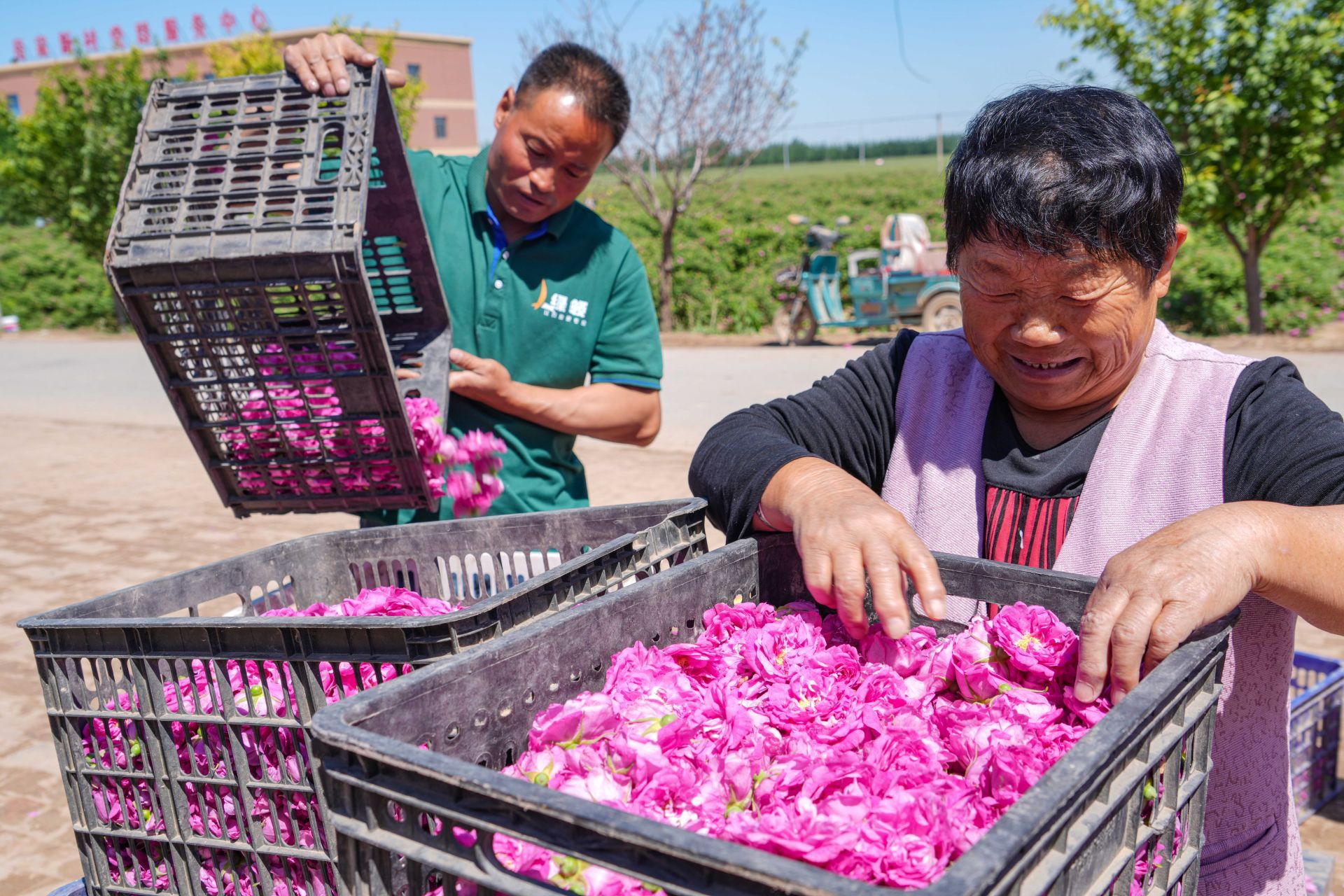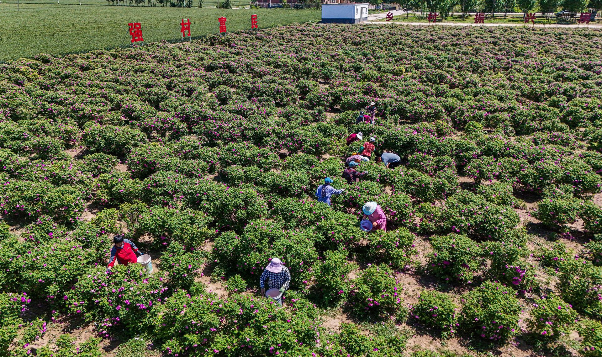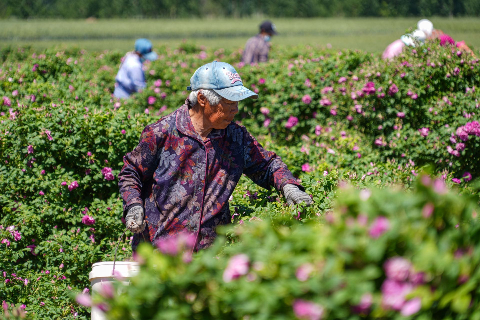 绿意葱茏的田野里,大朵大朵粉红色玫瑰花儿绽放,浓郁的香氛熏染得整个小村都醉了。从4月25日以来,高玉兰和村里的20多位留守老人,每天穿梭在玫瑰花丛中,一手提着花桶,一手捏住花冠,紧张有序采摘。