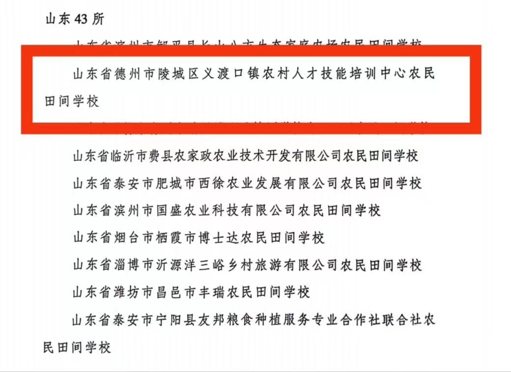 近日,中央农业广播电视学校(农业农村部农民科技教育培训中心)认定的第一批全国县级优质农民田间学校名单公布,陵城区义渡口镇农村人才技能培训中心农民田间学校成功入选,是我市唯一一家入选。
